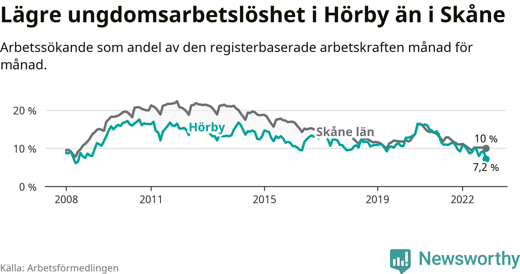 Precis som den totala arbetslösheten ligger ungdomsarbetslösheten i Hörby lägre än i Skåne som helhet. Skillnaden mellan kommunen och länet är 2,8 procentenheter.