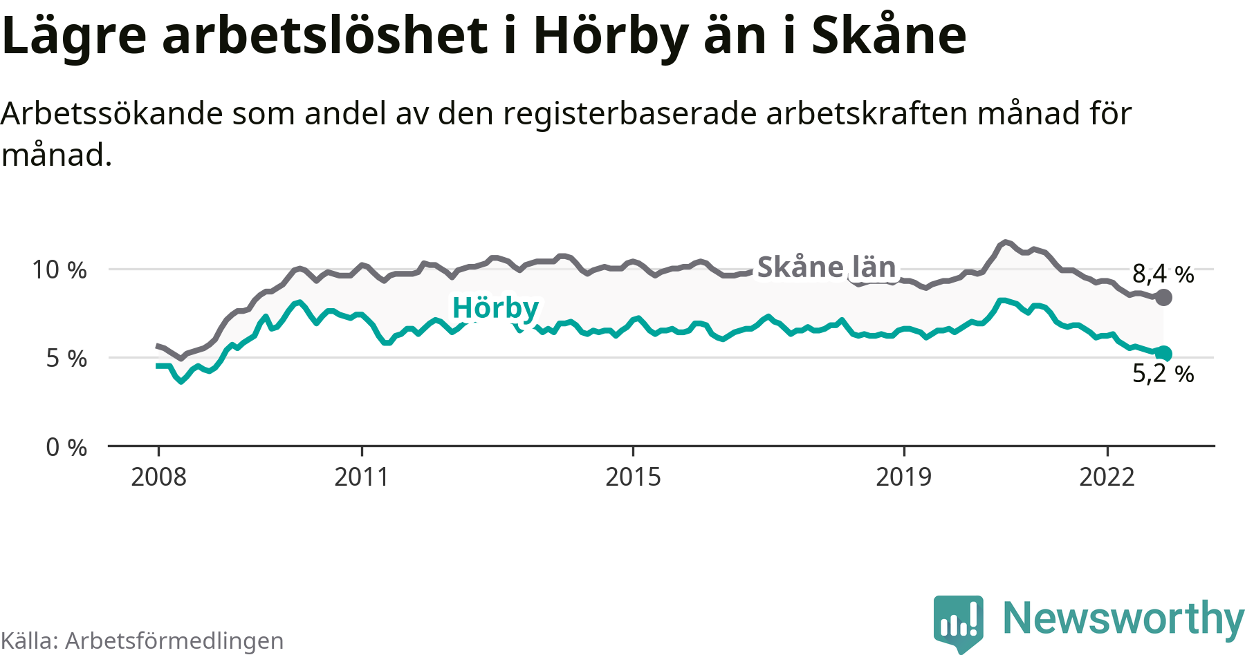 Det är 20:e månaden i följd som arbetslösheten i Hörby är lägre än den var under samma tidpunkt året innan. Sedan mars 2021 har arbetslösheten gått ner från 7,5 till 5,2 procent. Den nuvarande arbetslöshetsnivån är därmed den lägsta sedan december 2008.
