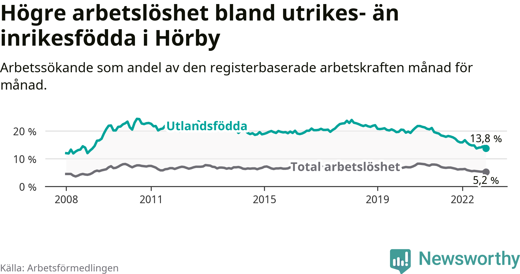 Skillnaden i arbetslöshet mellan utrikesfödda och hela befolkningen är 8,6 procentenheter i Hörby. Det är en betydligt mindre skillnad än för ett år sedan (−1,6 procentenheter).