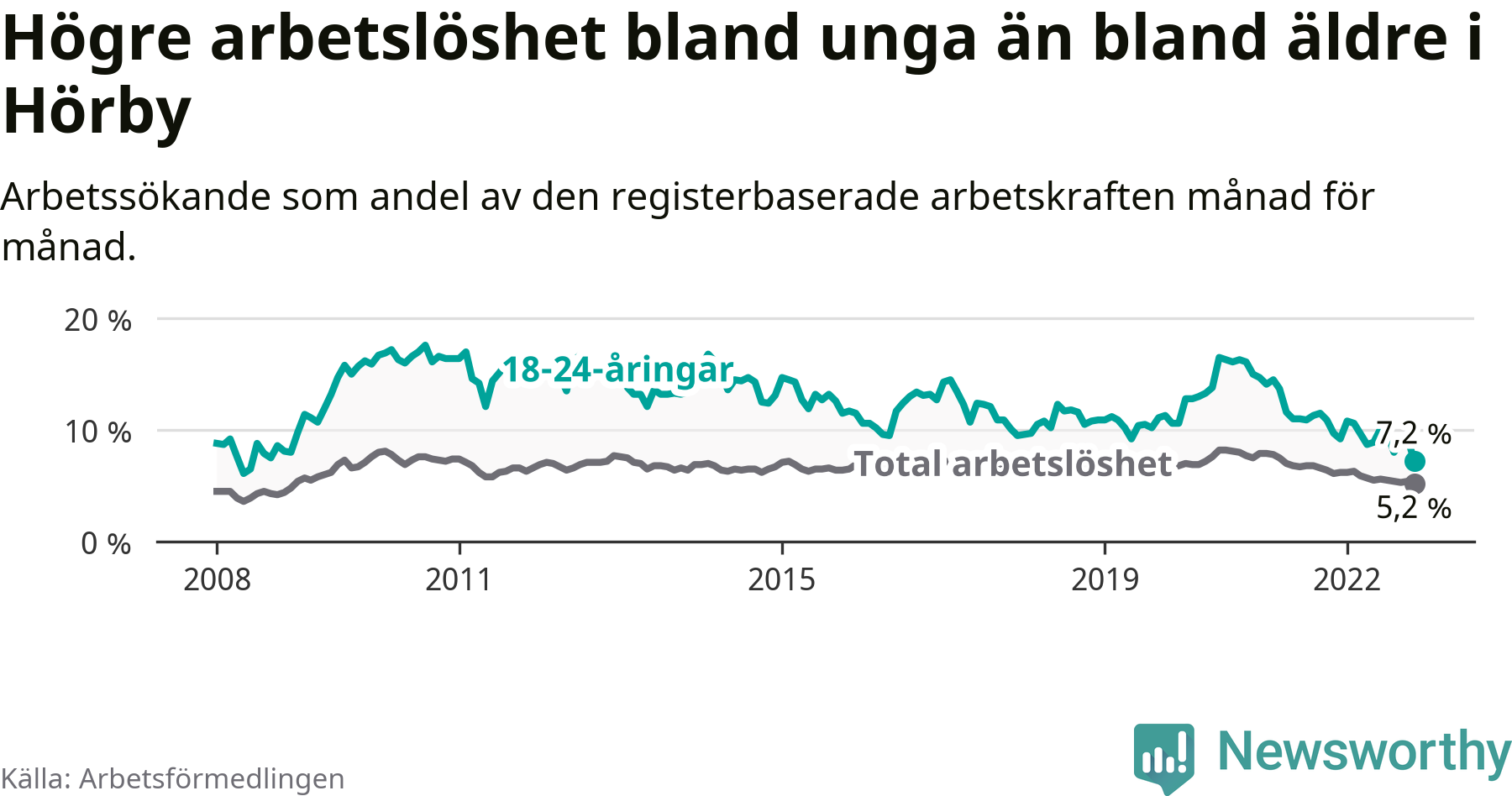 I och med den senaste månadens nedgång har de ungas arbetslöshet i Hörby sjunkit 20 månader i följd (ner från 13,7 procent i mars 2021 till 7,2 procent nu). Den nuvarande arbetslöshetsnivån är den lägsta sedan juni 2008.