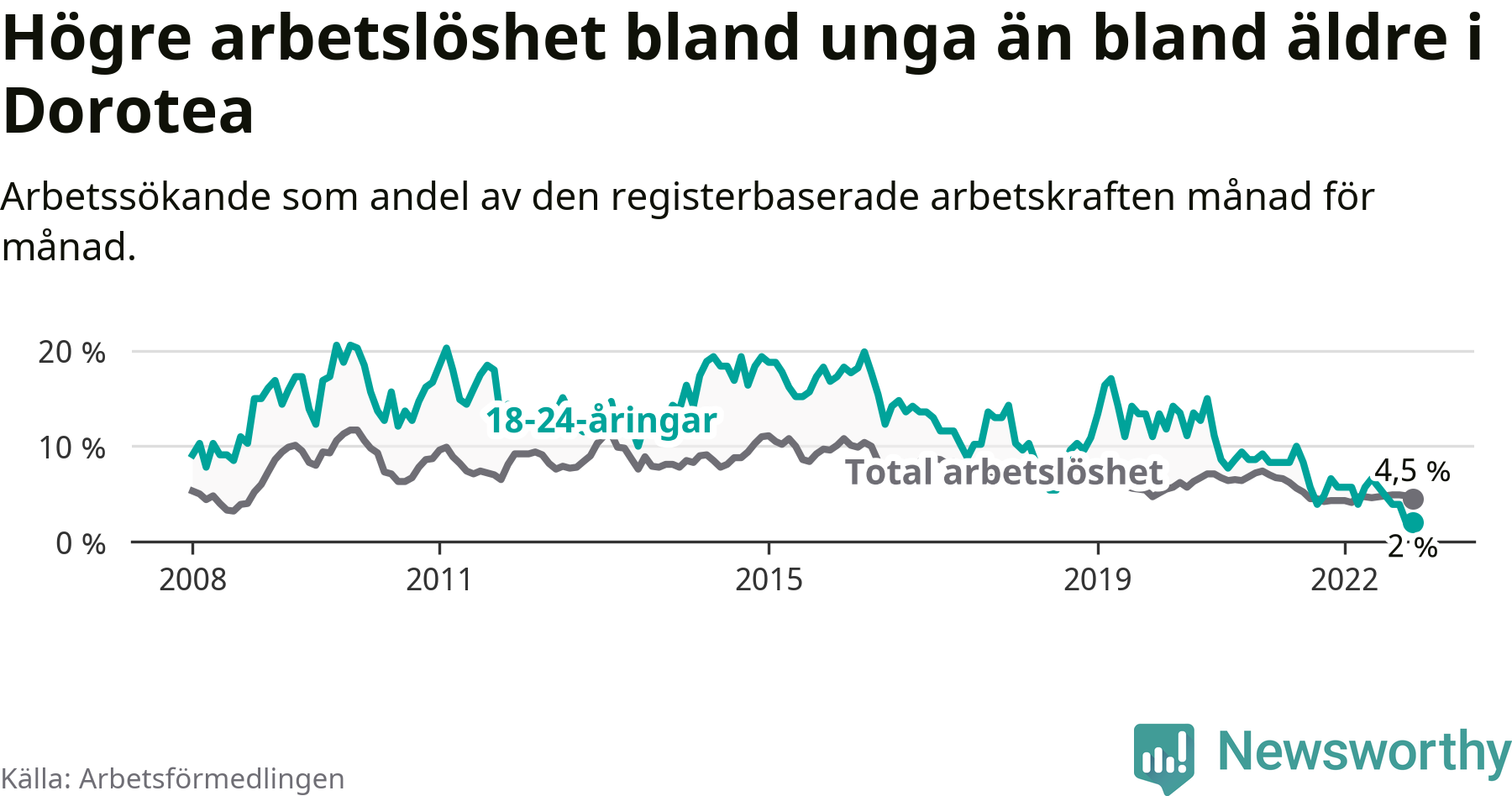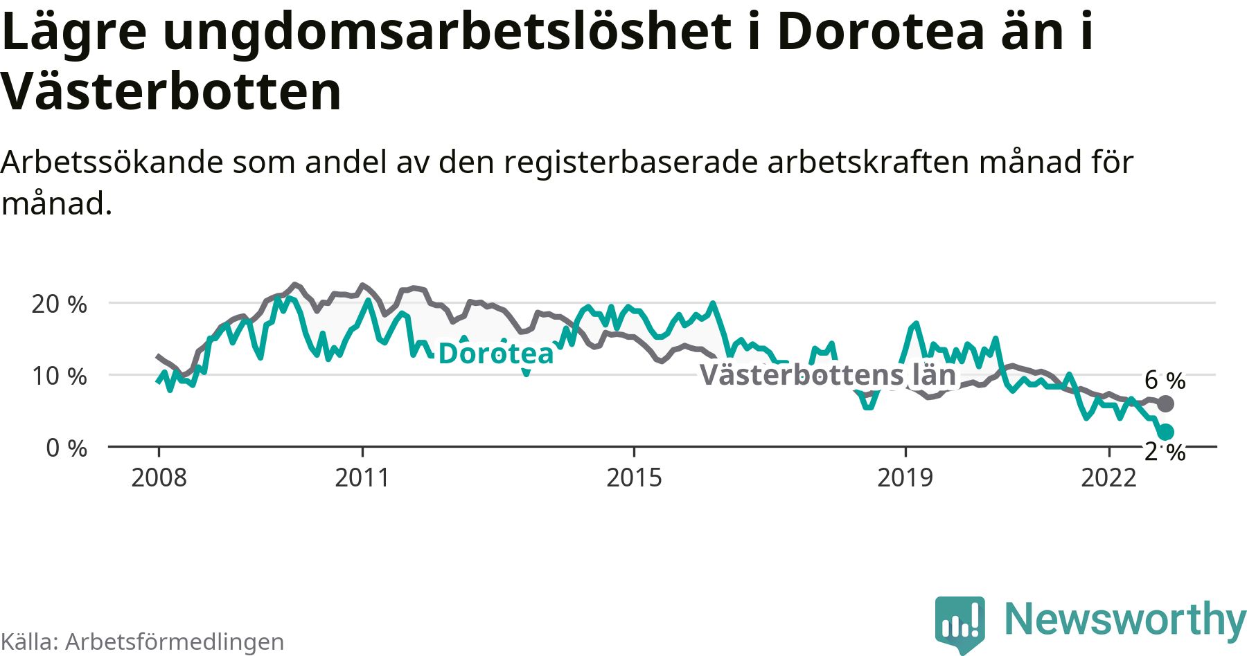 Medan Dorotea har högre total arbetslöshet än Västerbotten, ligger ungdomsarbetslösheten 4,0 procentenheter lägre i Dorotea.
