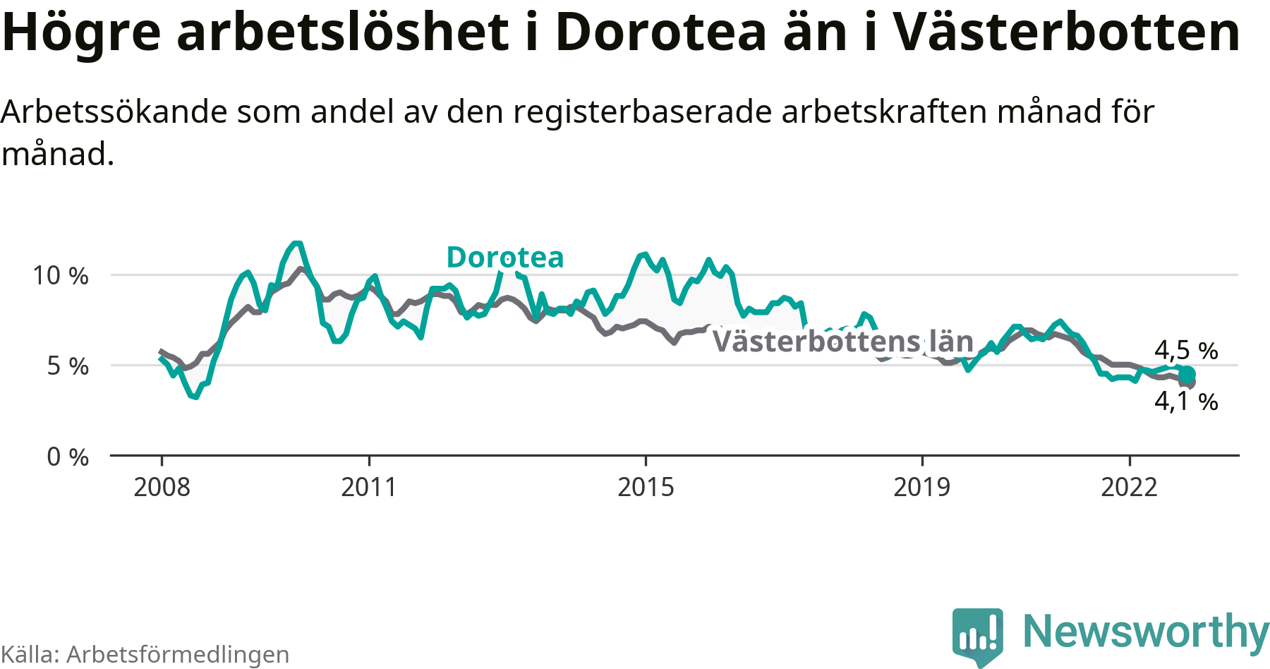 Dorotea hade redan tidigare högre arbetslöshet än snittet i hela Västerbottens län och nu växer klyftan (4,5 procent i kommunen, jämfört med 4,1 procent i hela länet). Skellefteå har den lägsta arbetslösheten i länet (3,4 procent), medan Åsele har den högsta (6,4 procent). För att Dorotea skulle komma ner i samma arbetslöshetsnivå som Skellefteå skulle tolv personer behöva sysselsättas.