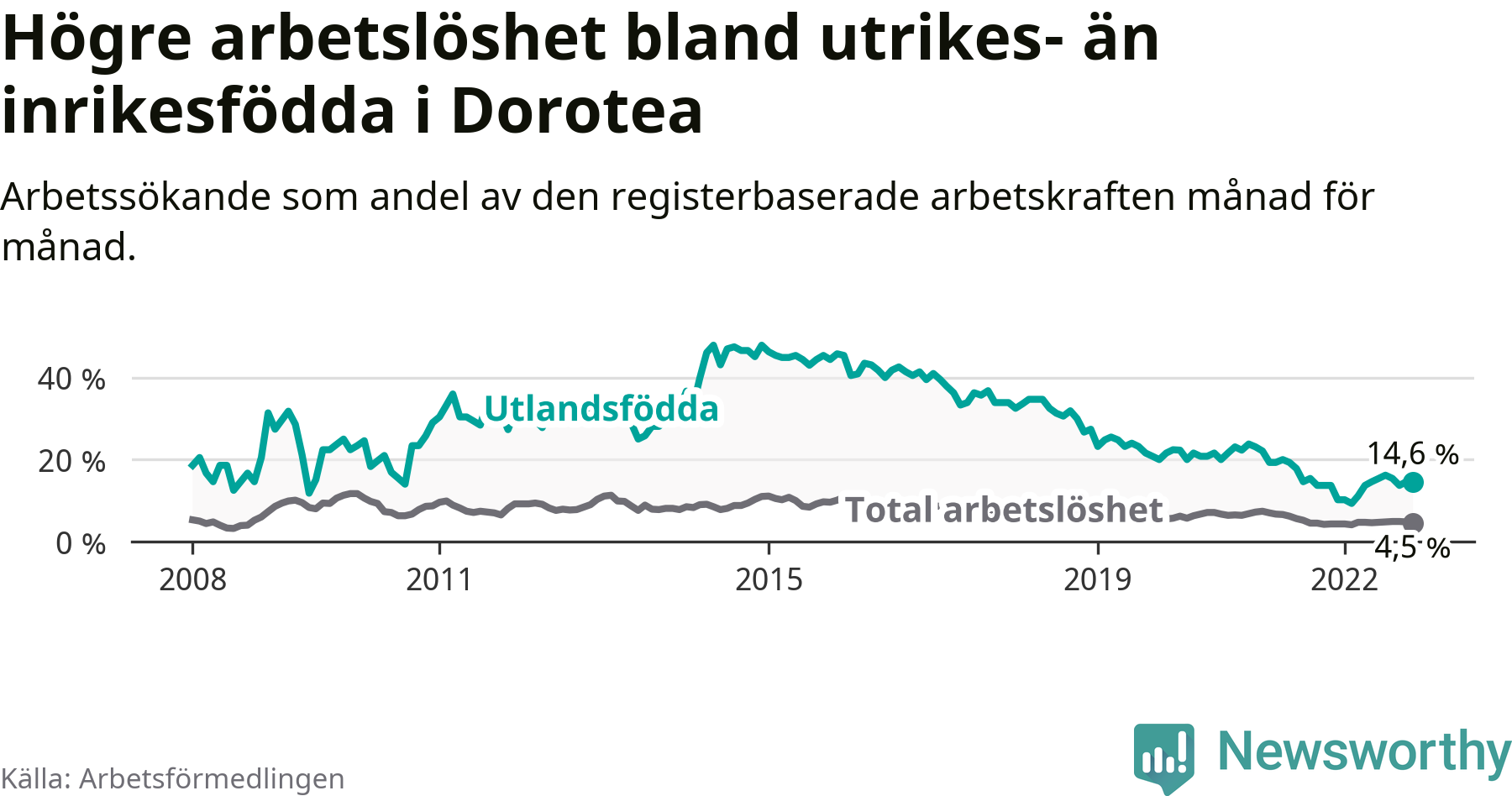 Skillnaden i arbetslöshet mellan utrikesfödda och hela befolkningen är 10,1 procentenheter i Dorotea. Det är en större skillnad än för ett år sedan (+0,7 procentenheter).