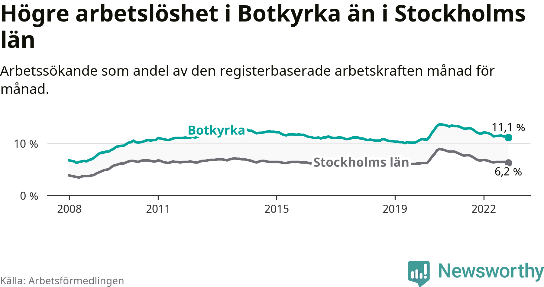 Även om arbetslösheten i Botkyrka alltså minskar, så ligger den fortfarande över snittet i hela Stockholms län (11,1 procent i kommunen, jämfört med 6,2 procent i hela länet). Botkyrka har därmed även den högsta arbetslöshetsnivån i länet. Ekerö har den lägsta (3,1 procent). För att Botkyrka skulle komma ner i samma arbetslöshetsnivå som Ekerö skulle 3 821 personer behöva sysselsättas.