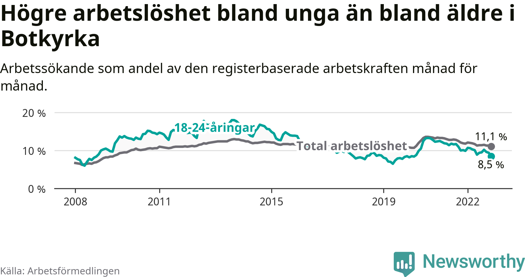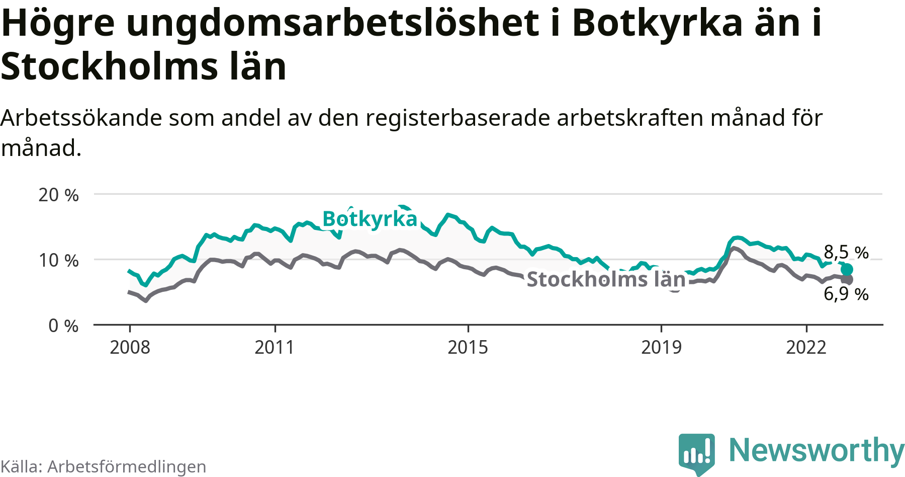 Precis som den totala arbetslösheten ligger ungdomsarbetslösheten i Botkyrka högre än i Stockholms län som helhet. Skillnaden mellan kommunen och länet är 1,6 procentenheter.