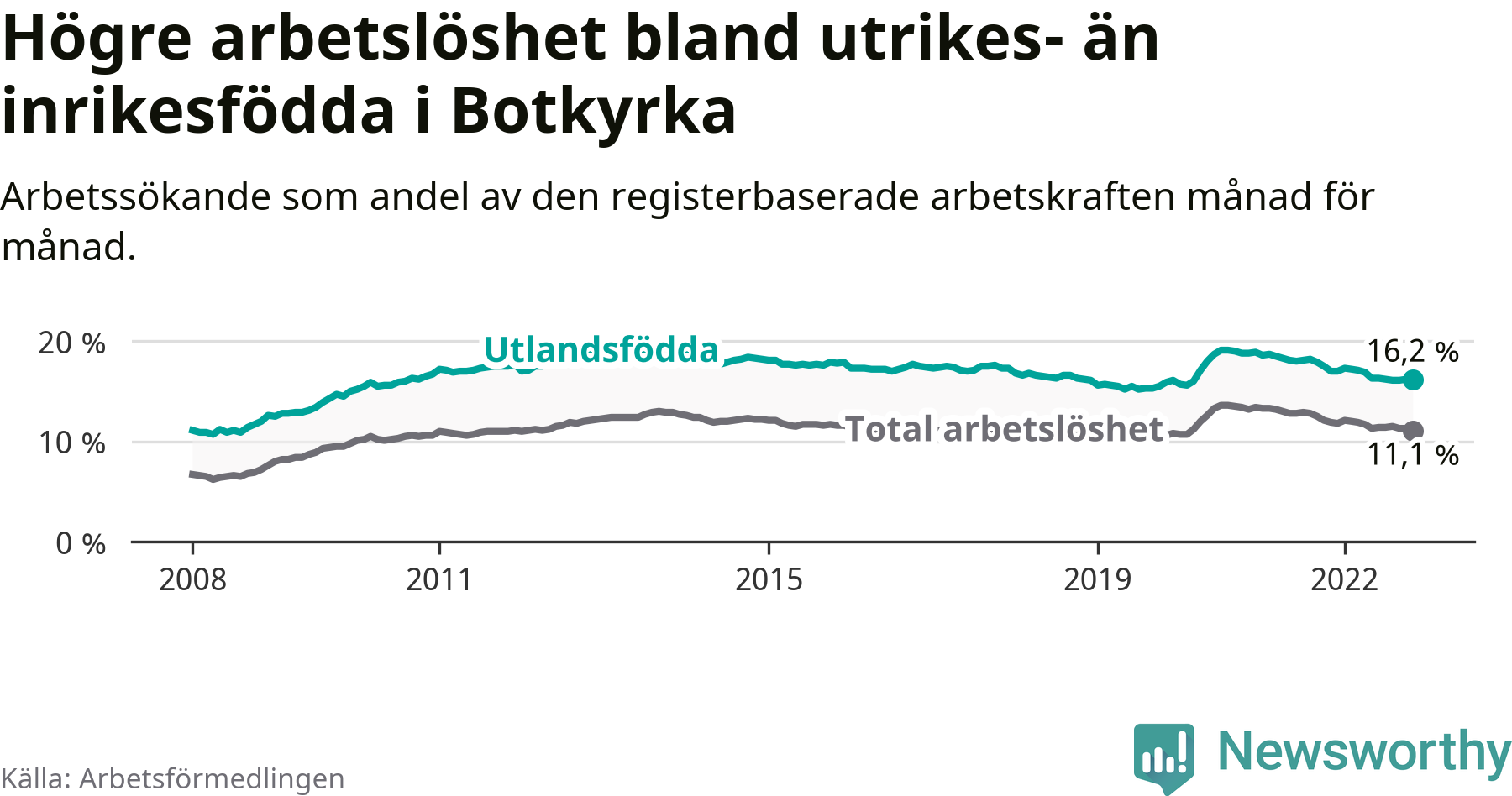 Arbetslösheten bland utlandsfödda var 16,2 procent i Botkyrka under november månad, motsvarande 4 138 av 25 543 personer. Det är 0,8 procentenheter färre än vid samma tidpunkt i fjol (−358 om man räknar personer). Därmed är de utlandsföddas arbetslöshet lägre än vid samma tidpunkt i fjol för 18:e månaden i följd. Sedan maj 2021 har arbetslösheten bland utlandsfödda minskat från 18,1 till 16,2 procent.