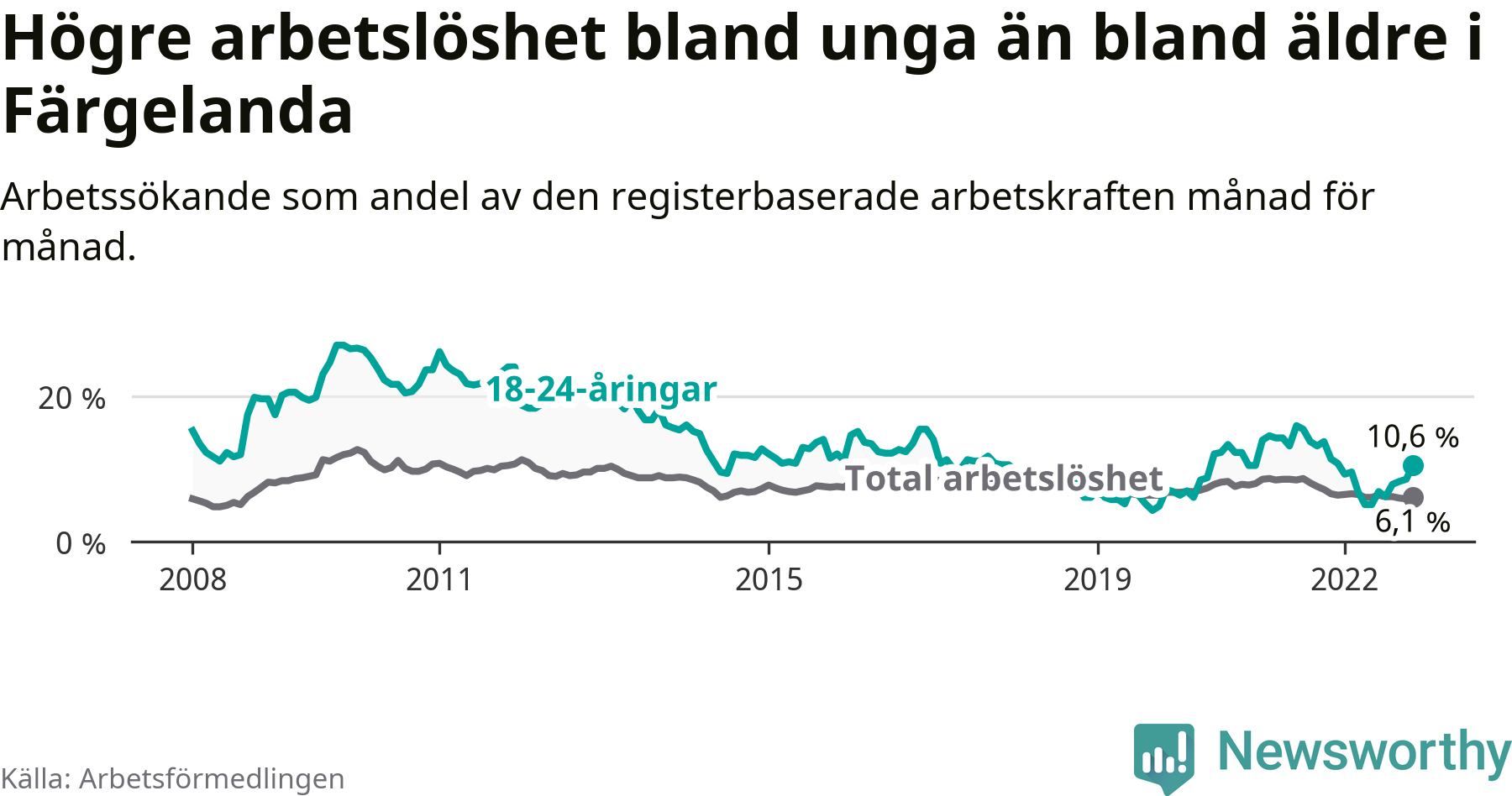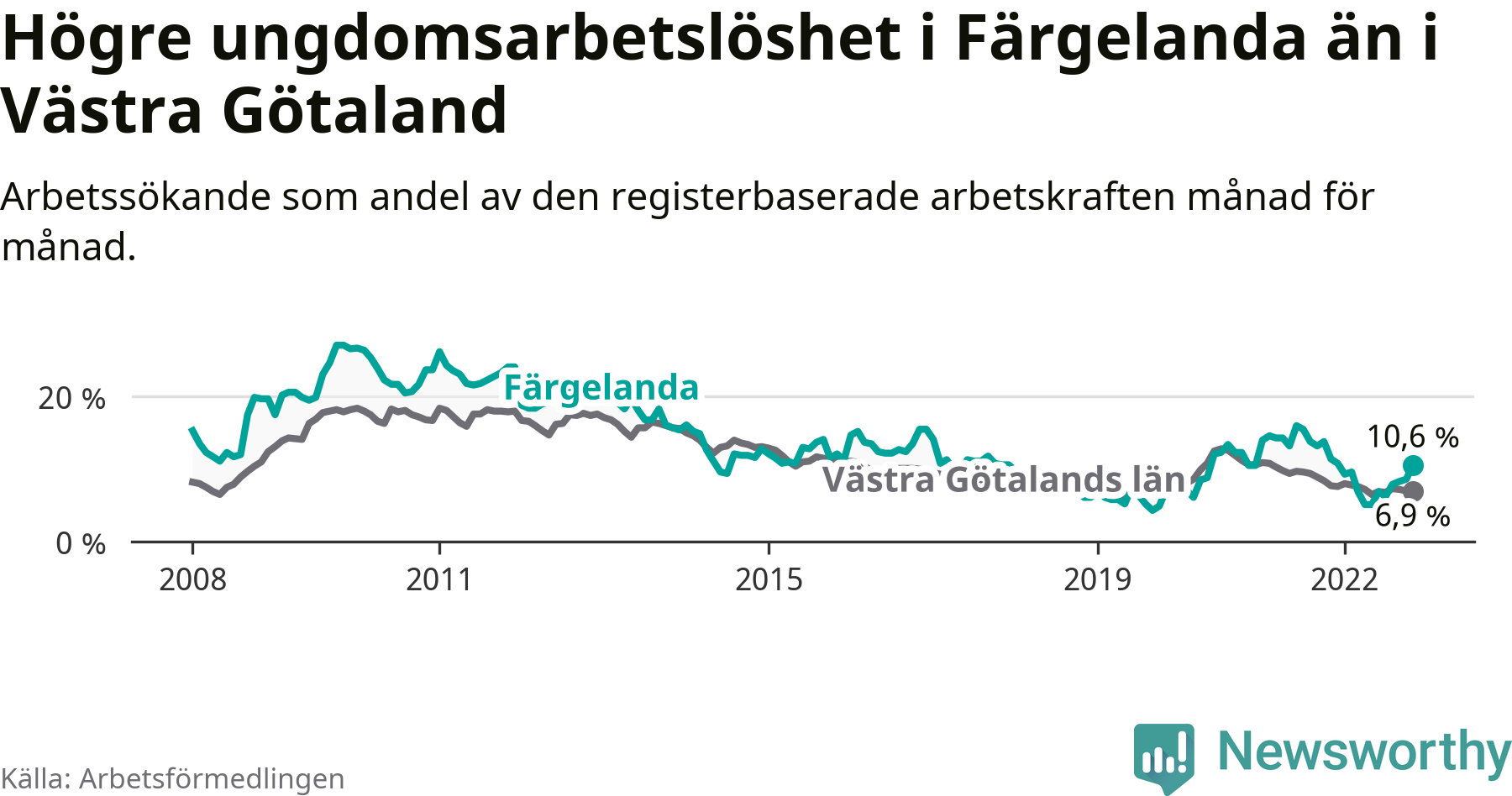 Precis som den totala arbetslösheten ligger ungdomsarbetslösheten i Färgelanda högre än i Västra Götaland som helhet. Skillnaden mellan kommunen och länet är 3,7 procentenheter.
