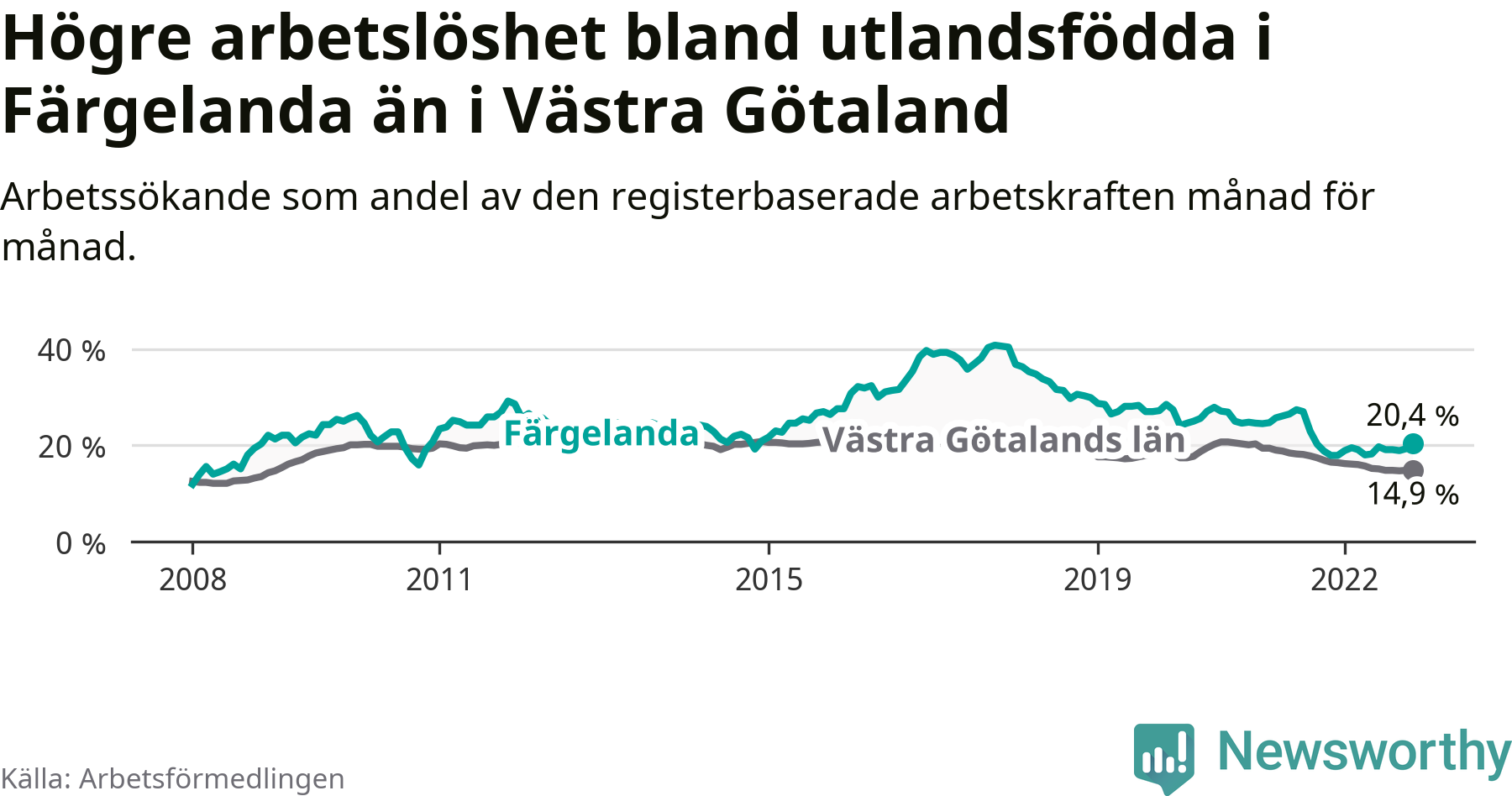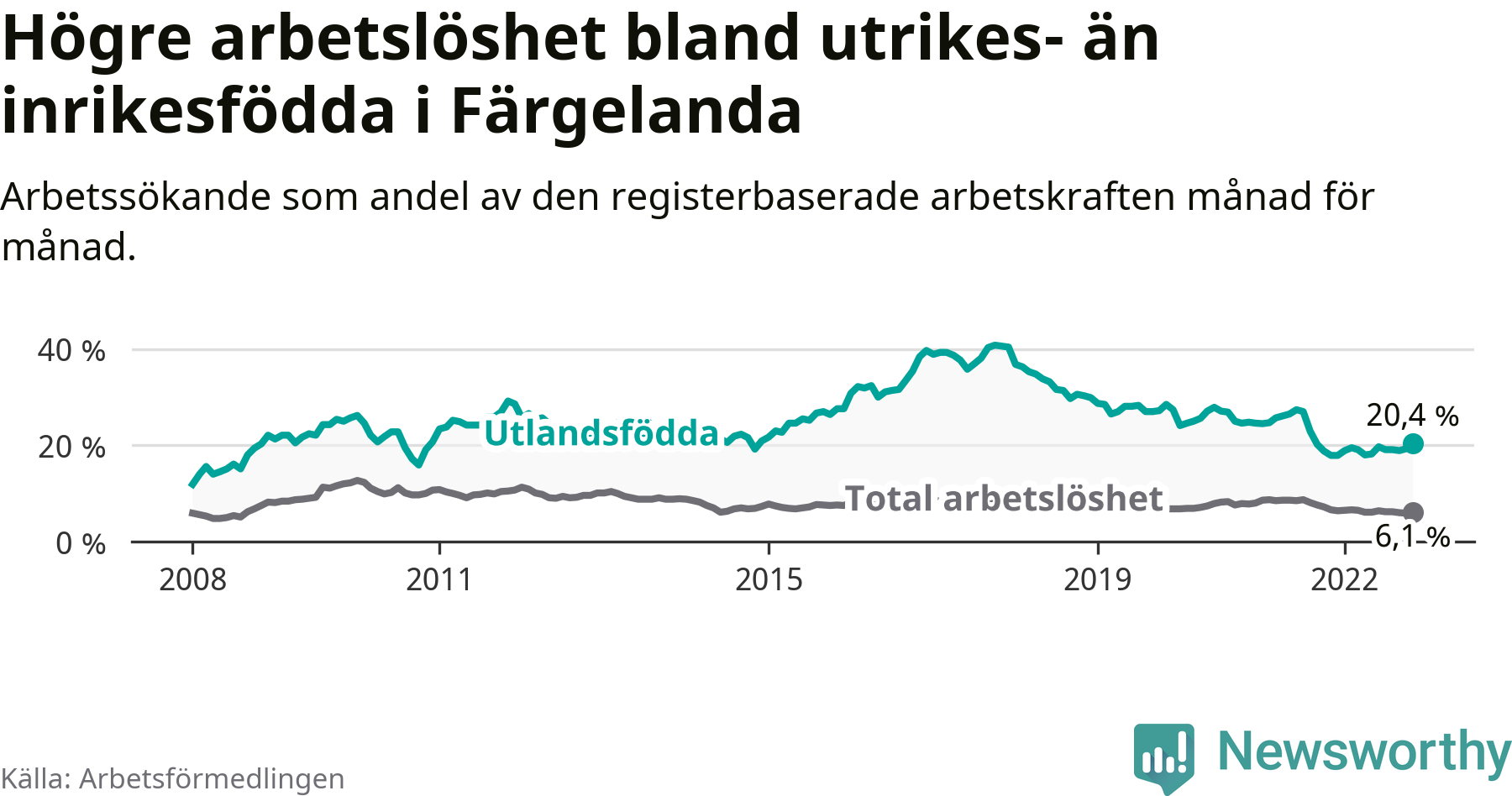 Arbetslösheten bland utlandsfödda var 20,4 procent i Färgelanda under november månad, motsvarande 76 av 373 personer. Det är 2,5 procentenheter fler än vid samma tidpunkt i fjol (+13 om man räknar personer).
