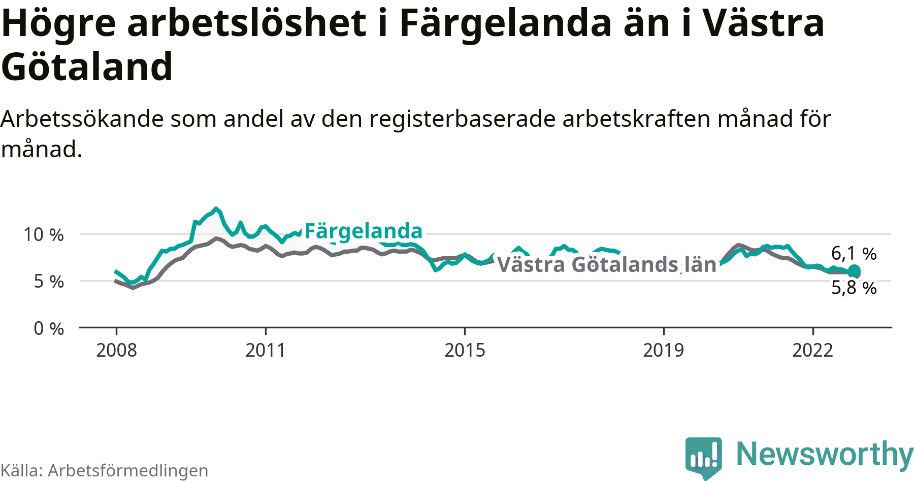 Det är 14:e månaden i följd som arbetslösheten i Färgelanda är lägre än den var under samma tidpunkt året innan. Sedan september 2021 har arbetslösheten gått ner från 7,6 till 6,1 procent.