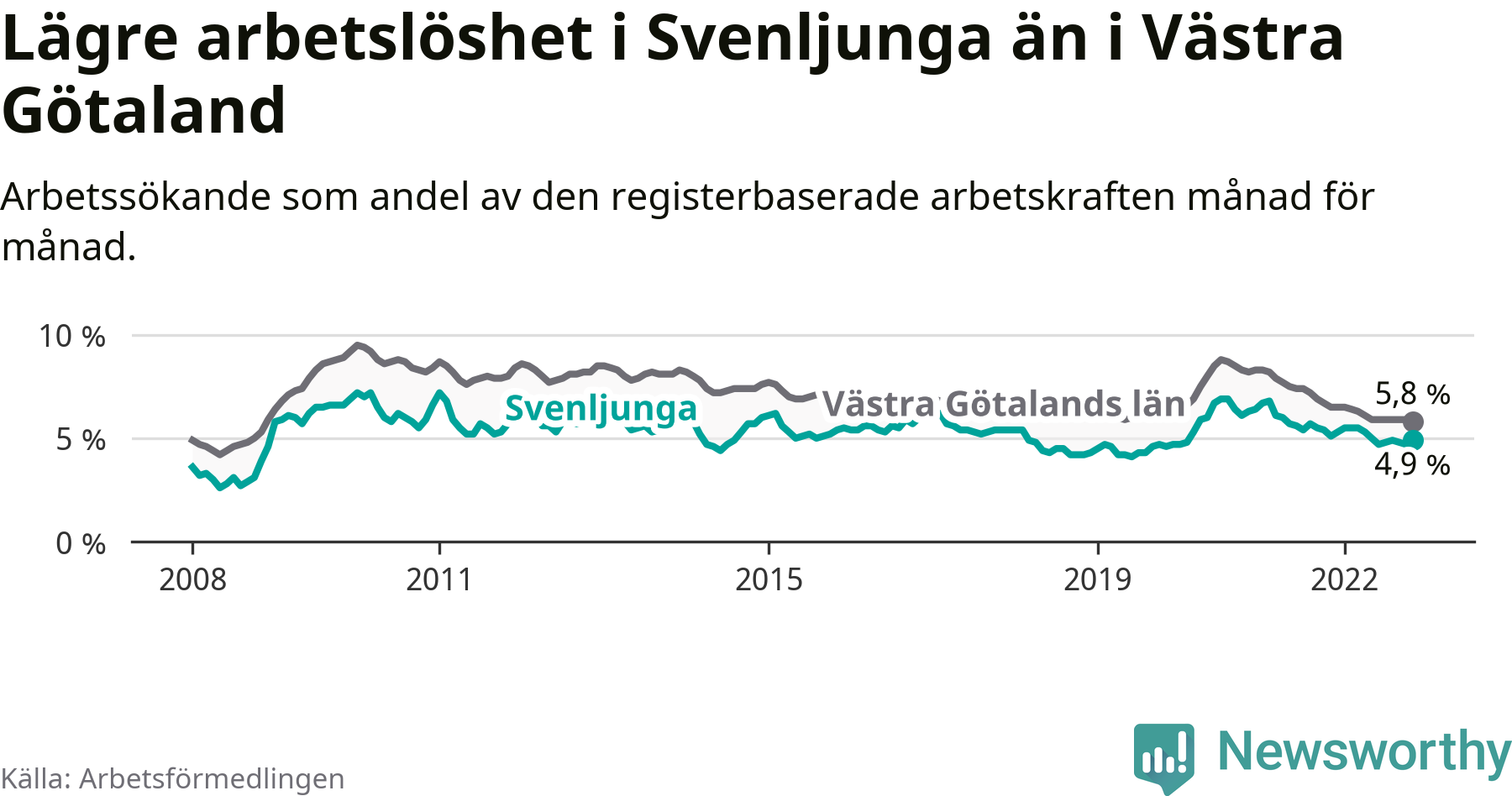 Svenljunga hade redan tidigare lägre arbetslöshet än snittet i hela Västra Götalands län och nu växer klyftan (4,9 procent i kommunen, jämfört med 5,8 procent i hela länet). Öckerö har den lägsta arbetslösheten i länet (2,5 procent), medan Trollhättan och Åmål har den högsta (9,1 procent). För att Svenljunga skulle komma ner i samma arbetslöshetsnivå som Öckerö skulle 117 personer behöva sysselsättas.