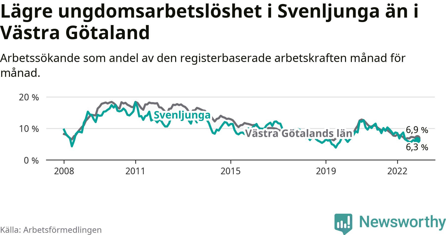 Precis som den totala arbetslösheten ligger ungdomsarbetslösheten i Svenljunga lägre än i Västra Götaland som helhet. Skillnaden mellan kommunen och länet är 0,6 procentenheter.