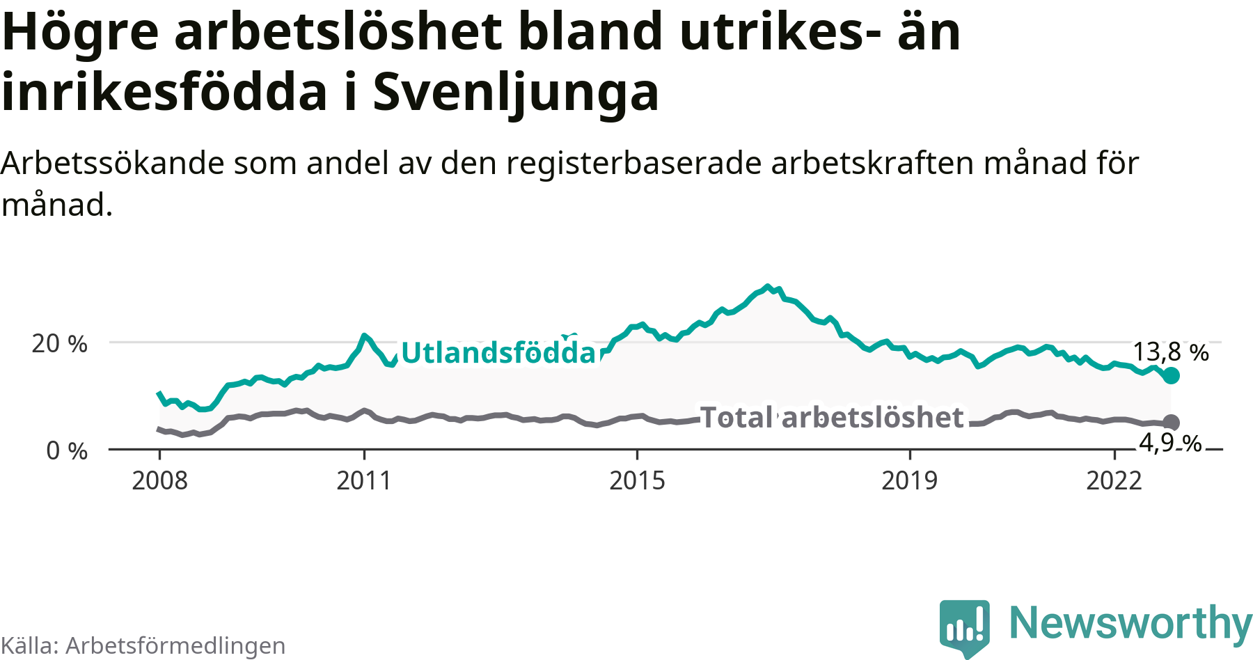 Skillnaden i arbetslöshet mellan utrikesfödda och hela befolkningen är 8,9 procentenheter i Svenljunga. Det är en mindre skillnad än för ett år sedan (−1,1 procentenheter).