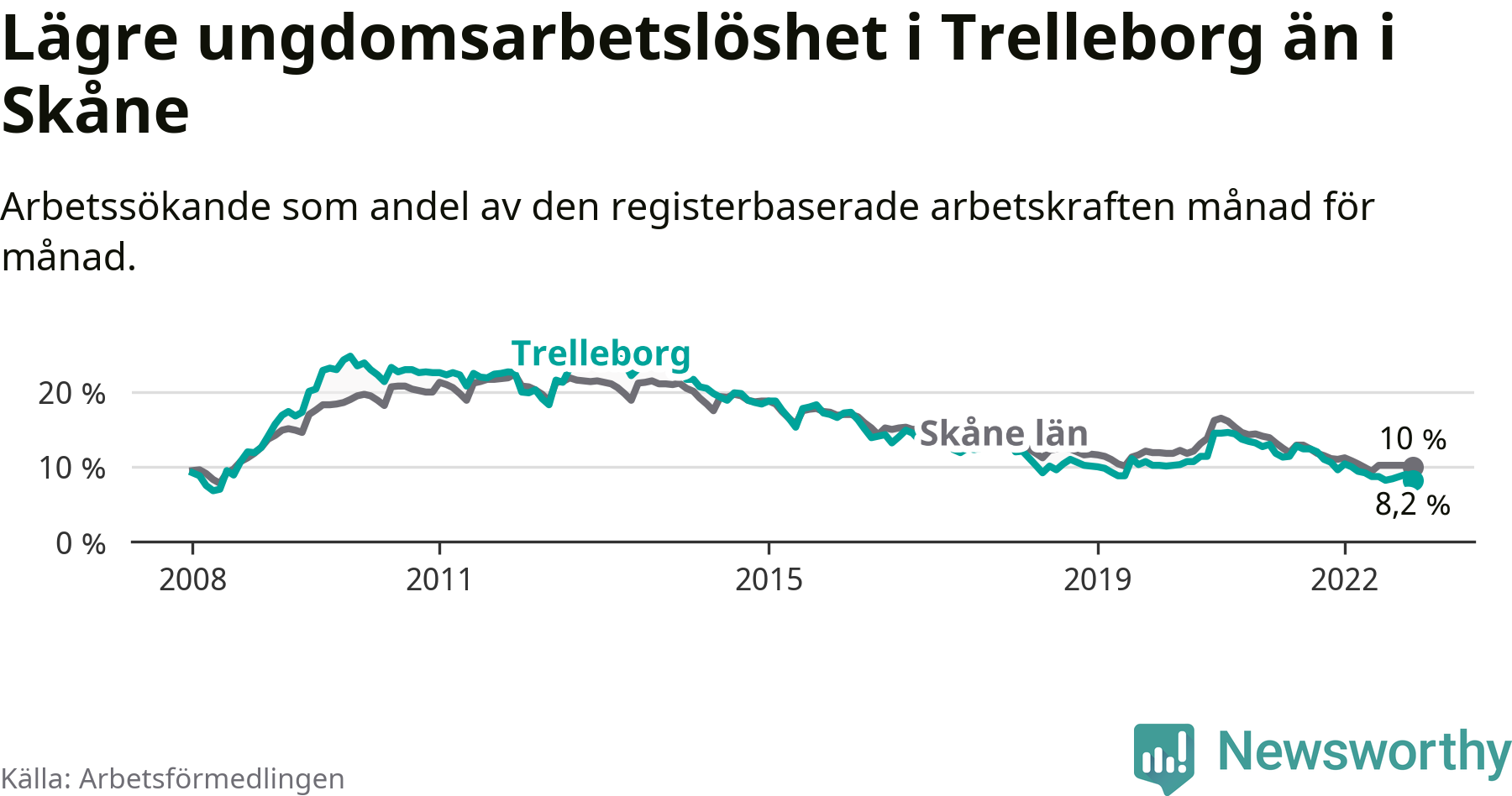 Precis som den totala arbetslösheten ligger ungdomsarbetslösheten i Trelleborg lägre än i Skåne som helhet. Skillnaden mellan kommunen och länet är 1,8 procentenheter.