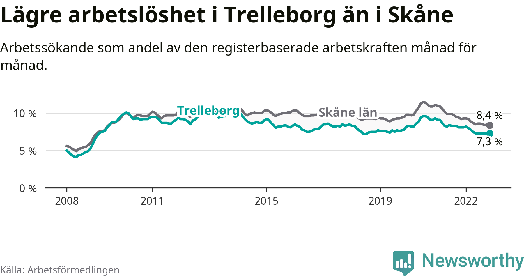 Trelleborg hade redan tidigare lägre arbetslöshet än snittet i hela Skåne län och nu växer klyftan (7,3 procent i kommunen, jämfört med 8,4 procent i hela länet). Lomma och Vellinge har den lägsta arbetslösheten i länet (3,2 procent), medan Perstorp har den högsta (12,6 procent). För att Trelleborg skulle komma ner i samma arbetslöshetsnivå som Lomma och Vellinge skulle 890 personer behöva sysselsättas.