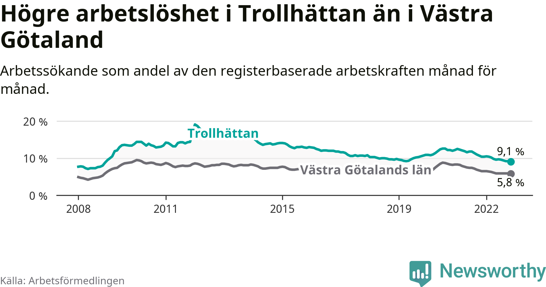 Det är 19:e månaden i följd som arbetslösheten i Trollhättan är lägre än den var under samma tidpunkt året innan. Sedan april 2021 har arbetslösheten gått ner från 11,9 till 9,1 procent. Den nuvarande arbetslöshetsnivån är därmed den lägsta sedan december 2008.