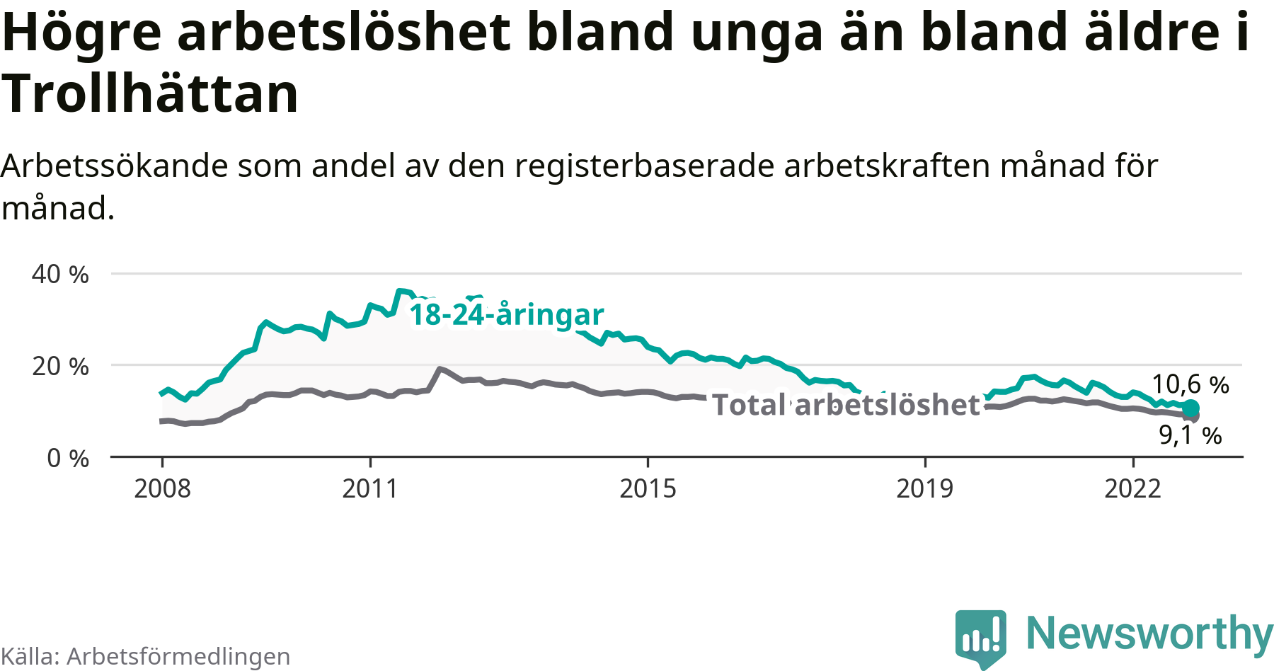 Precis som den totala arbetslösheten ligger ungdomsarbetslösheten i Trollhättan högre än i Västra Götaland som helhet. Skillnaden mellan kommunen och länet är 3,7 procentenheter.
