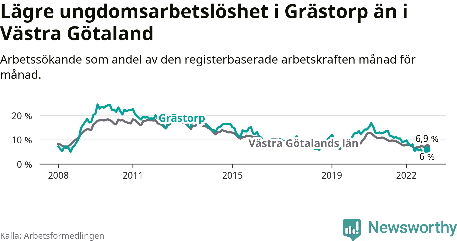 Precis som den totala arbetslösheten ligger ungdomsarbetslösheten i Grästorp lägre än i Västra Götaland som helhet. Skillnaden mellan kommunen och länet är 0,9 procentenheter.