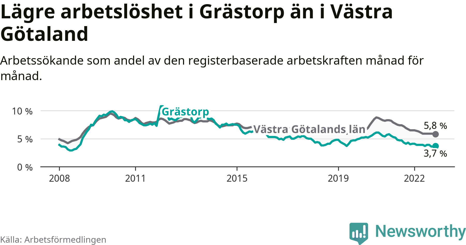 Grästorp hade redan tidigare lägre arbetslöshet än snittet i hela Västra Götalands län och nu växer klyftan (3,7 procent i kommunen, jämfört med 5,8 procent i hela länet). Öckerö har den lägsta arbetslösheten i länet (2,5 procent), medan Trollhättan och Åmål har den högsta (9,1 procent). För att Grästorp skulle komma ner i samma arbetslöshetsnivå som Öckerö skulle 32 personer behöva sysselsättas.