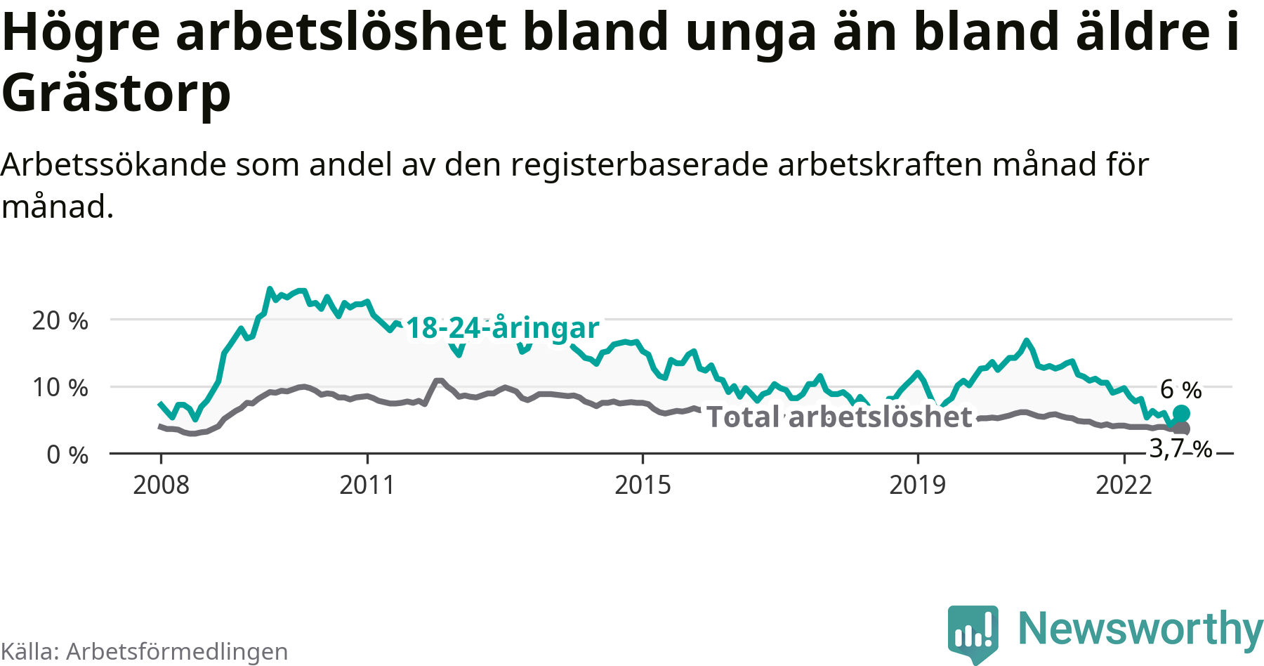 I och med den senaste månadens nedgång har de ungas arbetslöshet i Grästorp sjunkit 19 månader i följd (ner från 13,7 procent i april 2021 till 6,0 procent nu).