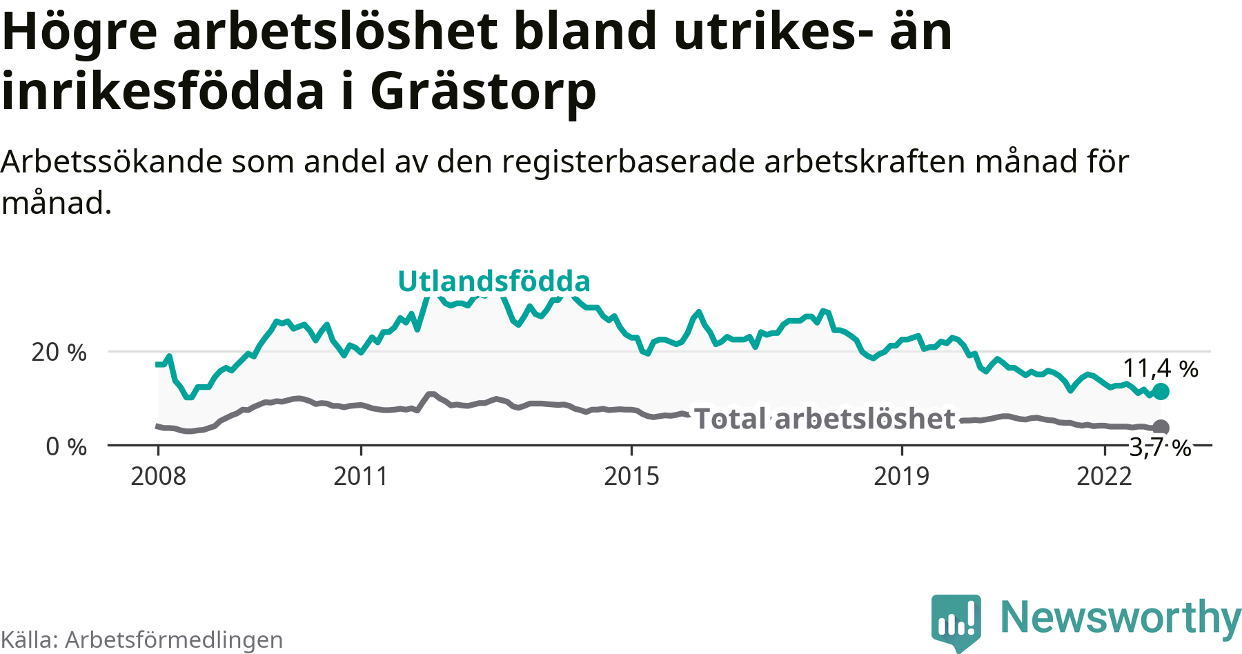 Skillnaden i arbetslöshet mellan utrikesfödda och hela befolkningen är 7,7 procentenheter i Grästorp. Det är en betydligt mindre skillnad än för ett år sedan (−3,0 procentenheter).