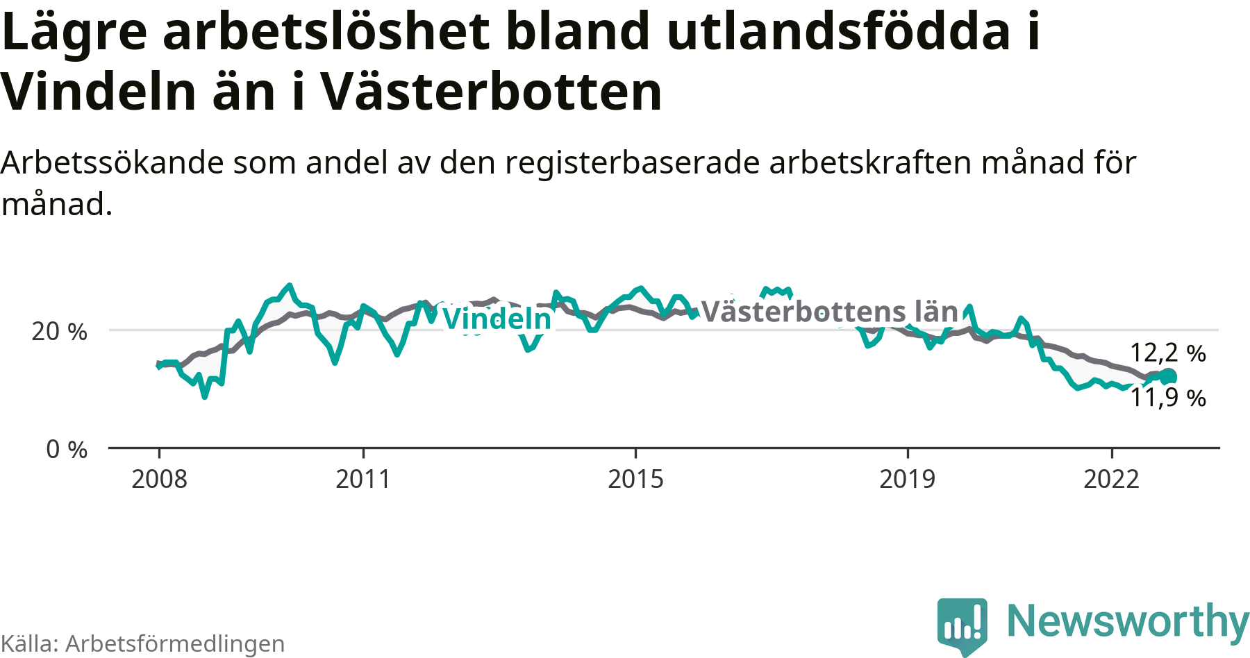 Medan arbetslösheten bland utlandsfödda alltså ökar i Vindeln så minskar den i Västerbotten. Jämfört med november förra året har andelen arbetslösa utlandsfödda i länet minskat med 2,4 procentenheter (till 12,2 procent). Trots den senaste uppgången har Vindeln med andra ord fortfarande lägre arbetslöshet bland utlandsfödda än Västerbotten.