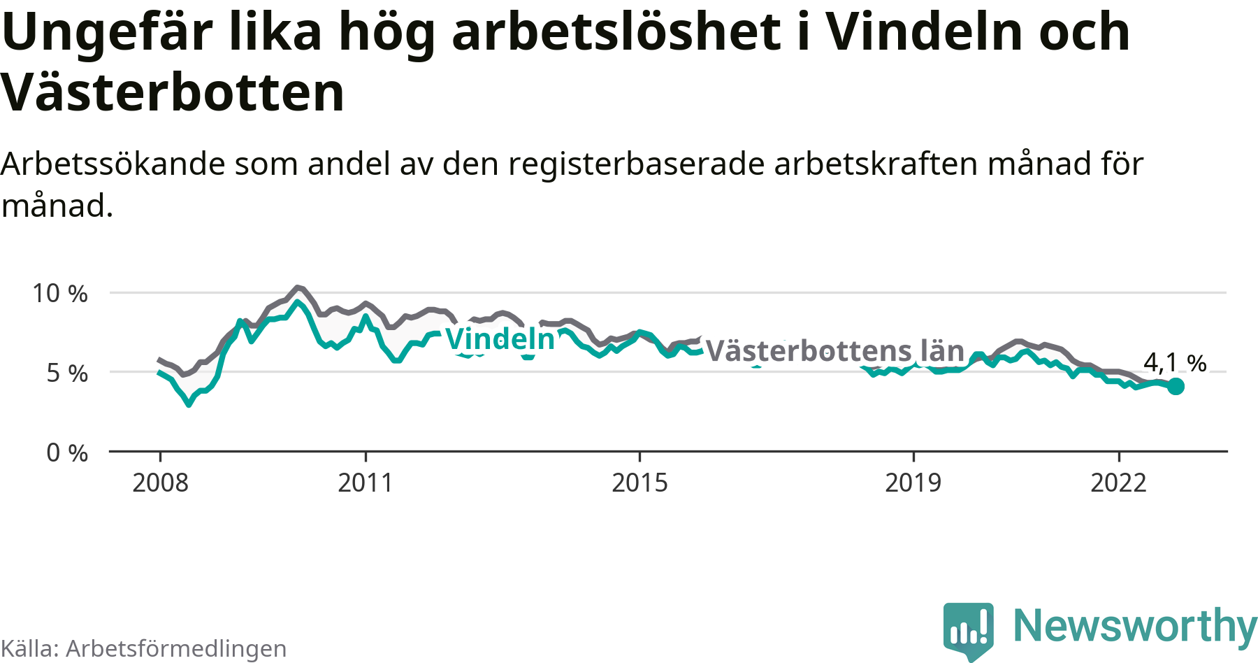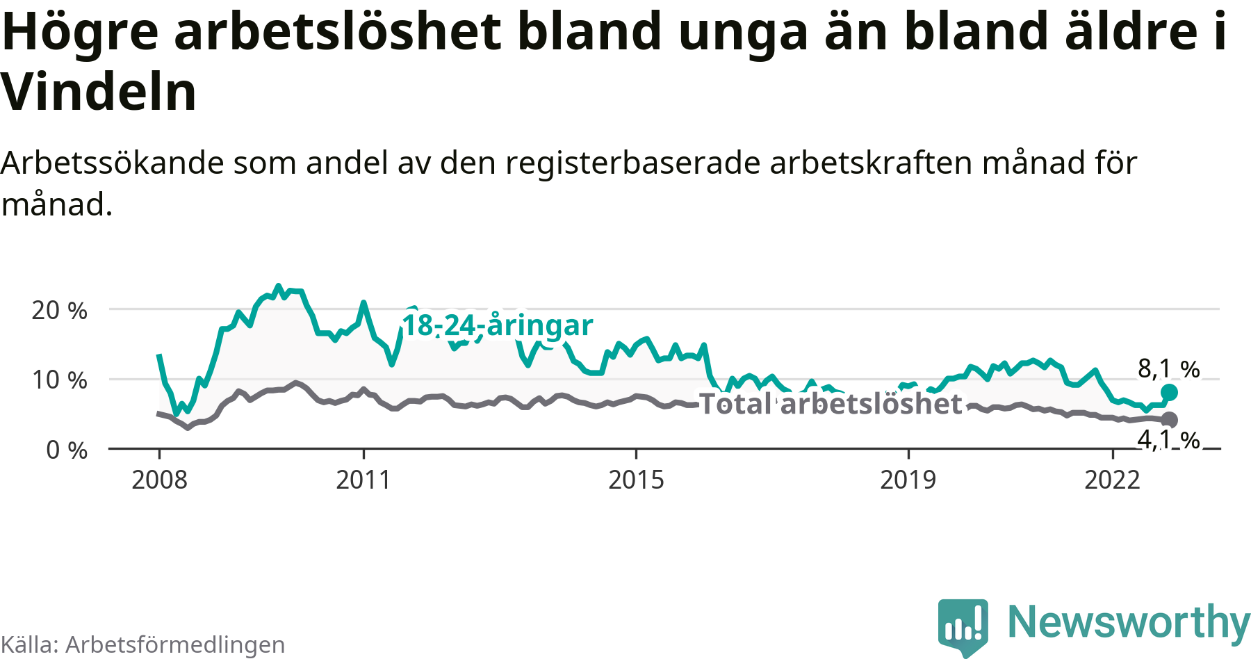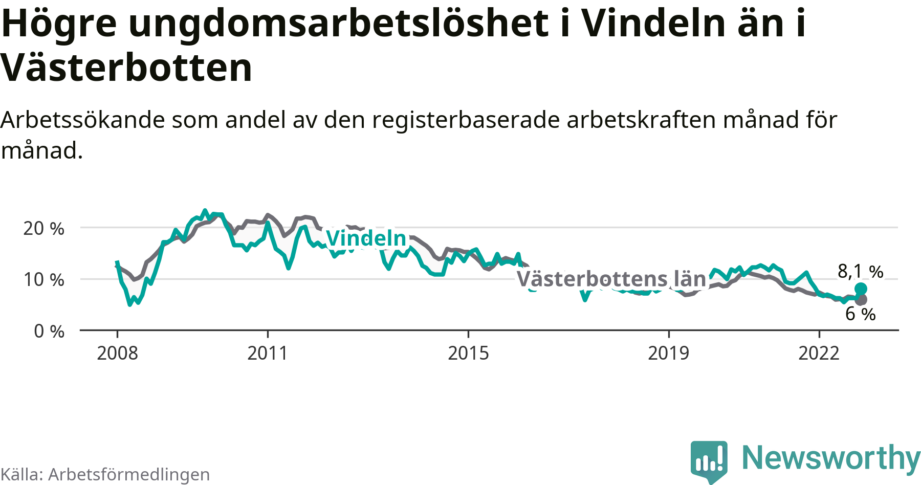 Medan Vindeln har ungefär samma total arbetslöshet som Västerbotten, ligger ungdomsarbetslösheten 2,1 procentenheter högre i Vindeln.