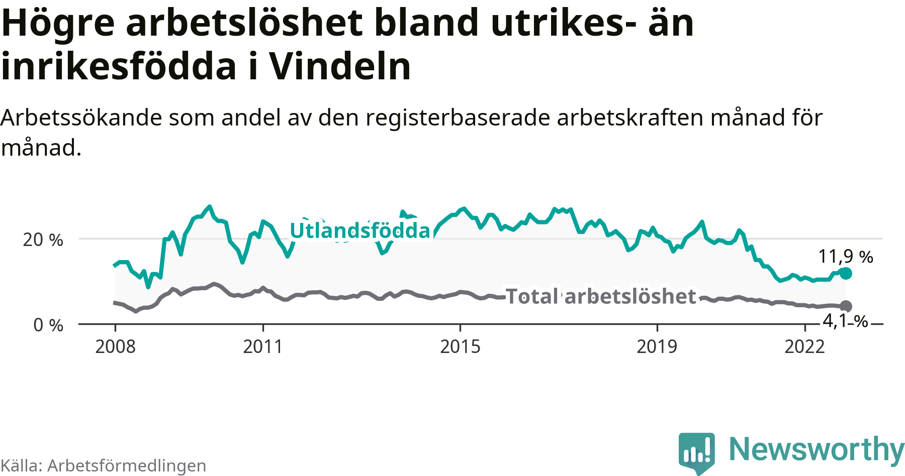 Arbetslösheten bland utlandsfödda var 11,9 procent i Vindeln under november månad, motsvarande 41 av 345 personer. Det är 0,7 procentenheter fler än vid samma tidpunkt i fjol (+3 om man räknar personer).