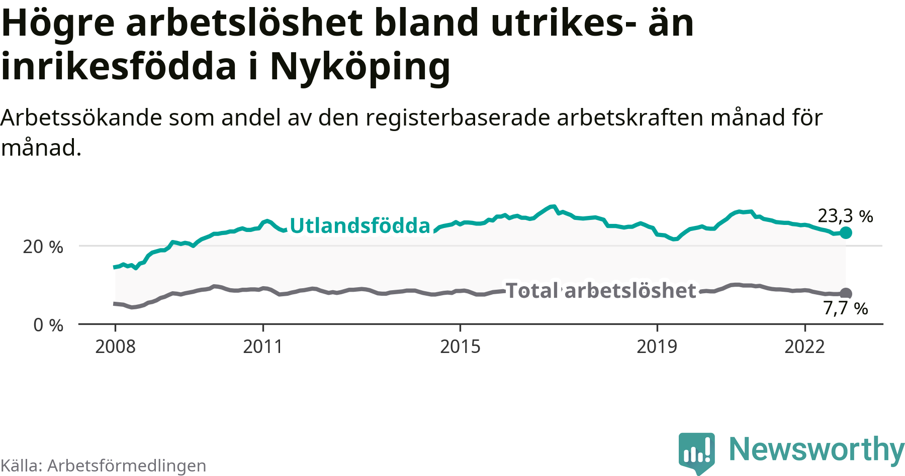 Skillnaden i arbetslöshet mellan utrikesfödda och hela befolkningen är 15,6 procentenheter i Nyköping. Det är en mindre skillnad än för ett år sedan (−1,3 procentenheter).