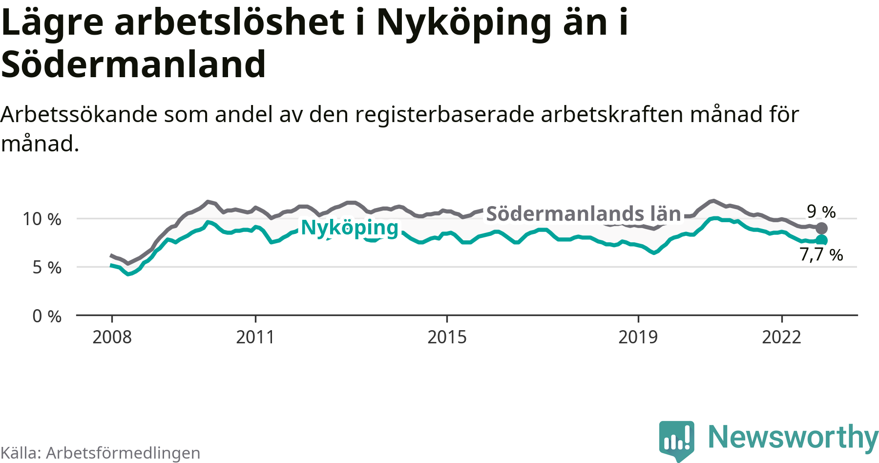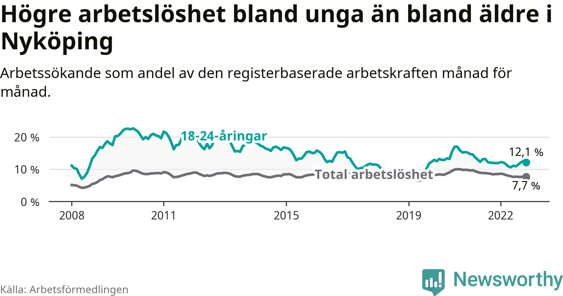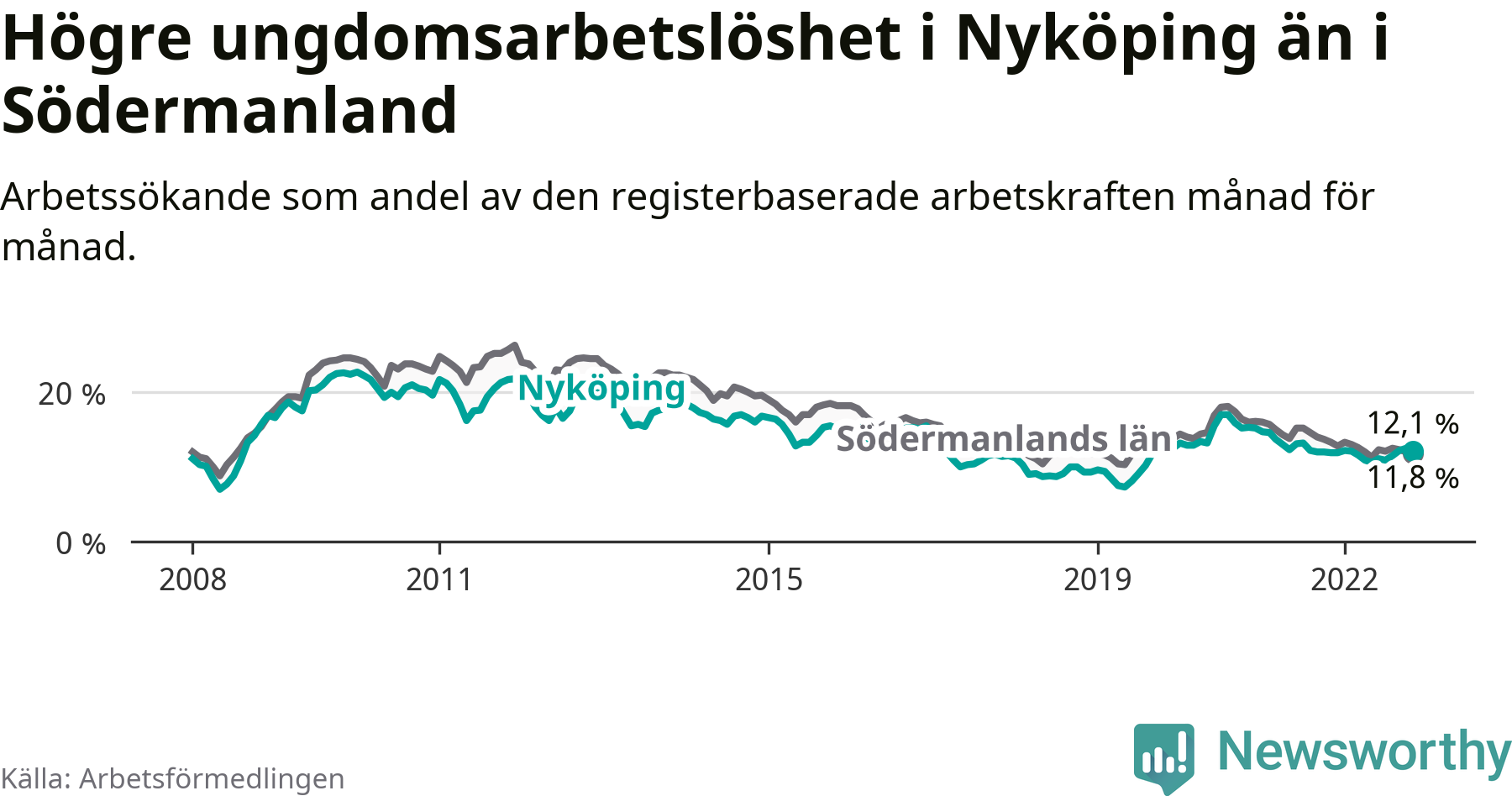 Medan Nyköping har lägre total arbetslöshet än Södermanland, ligger ungdomsarbetslösheten 0,3 procentenheter högre i Nyköping.