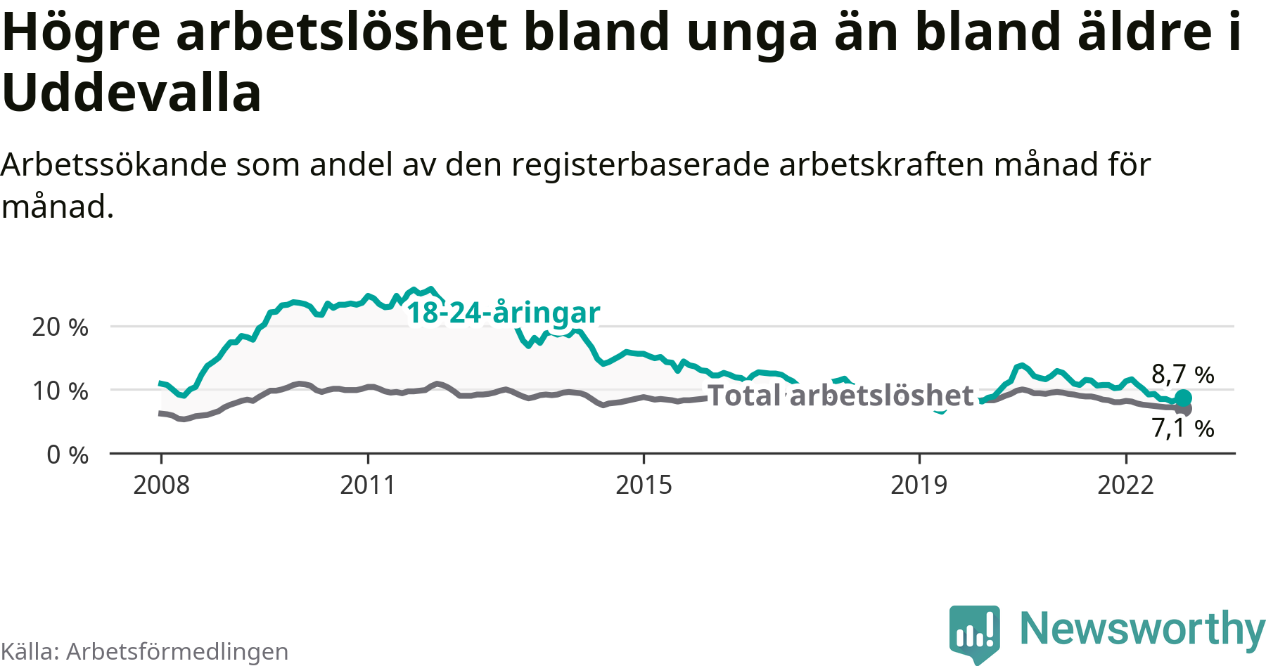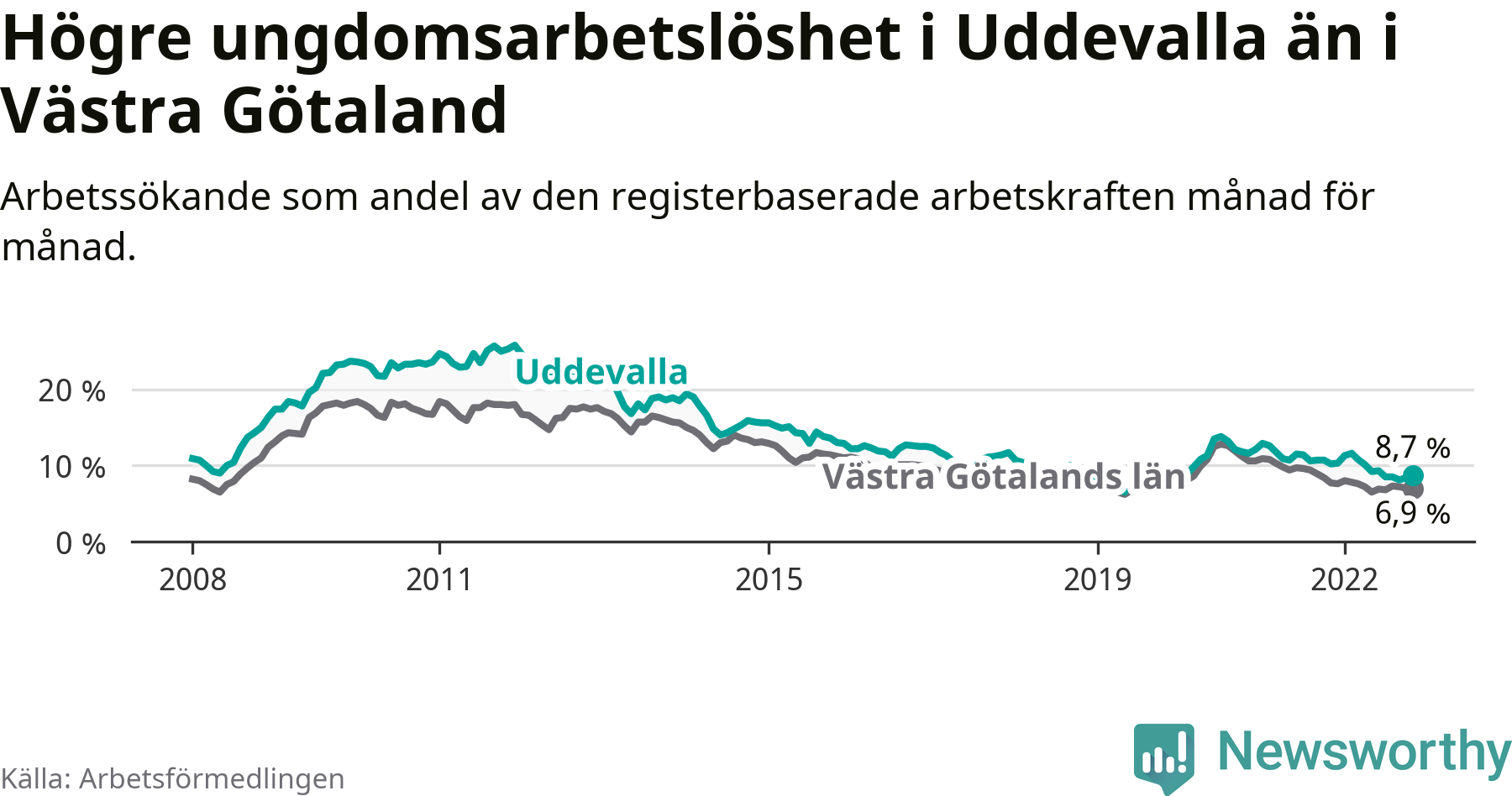 Precis som den totala arbetslösheten ligger ungdomsarbetslösheten i Uddevalla högre än i Västra Götaland som helhet. Skillnaden mellan kommunen och länet är 1,8 procentenheter.