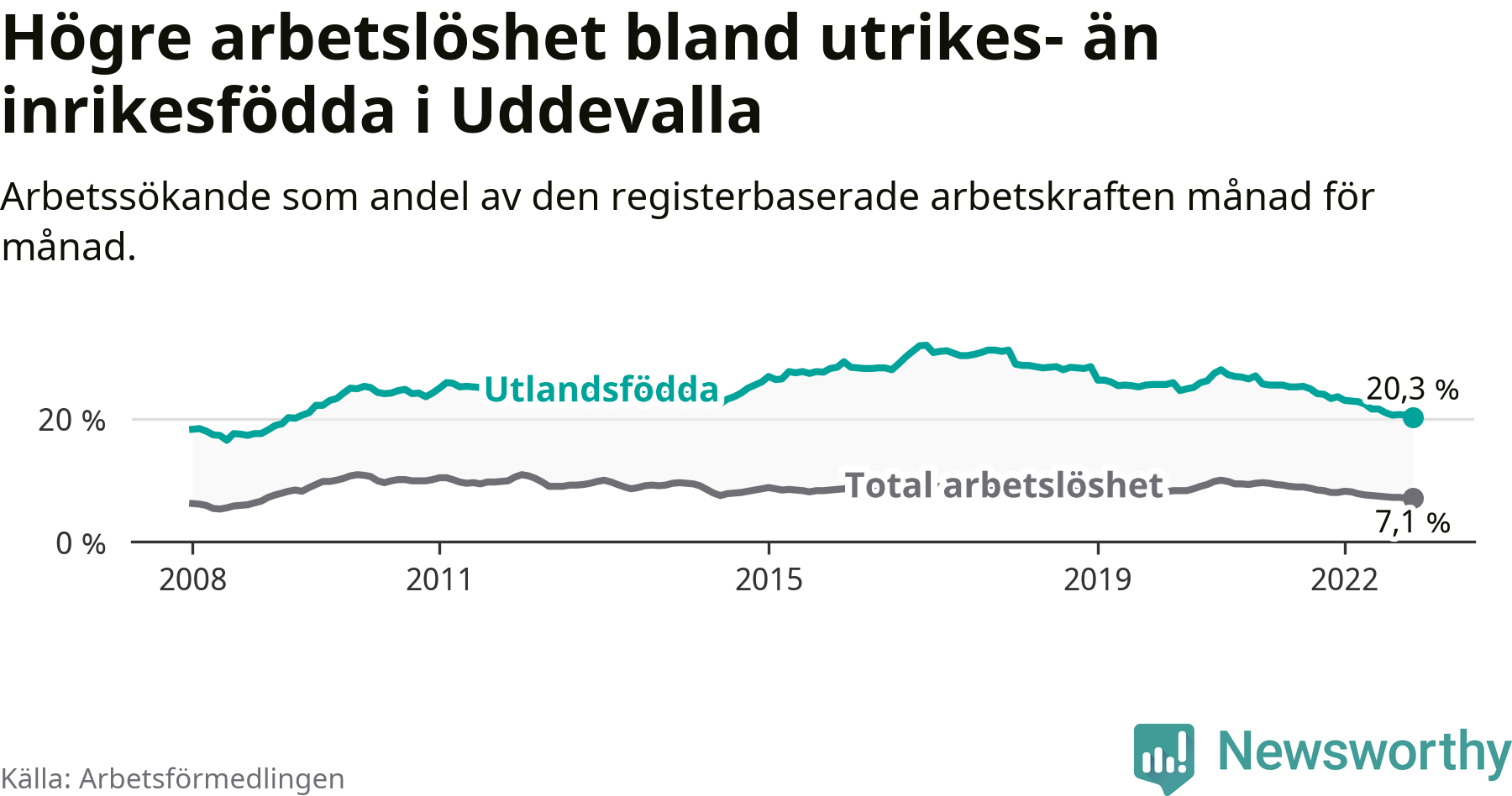 Skillnaden i arbetslöshet mellan utrikesfödda och hela befolkningen är 13,2 procentenheter i Uddevalla. Det är en betydligt mindre skillnad än för ett år sedan (−2,1 procentenheter).
