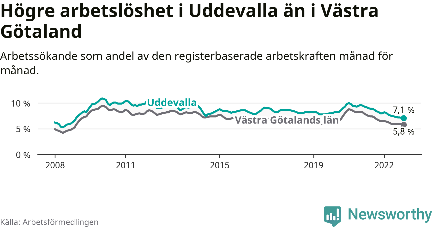 Även om arbetslösheten i Uddevalla alltså minskar, så ligger den fortfarande över snittet i hela Västra Götalands län (7,1 procent i kommunen, jämfört med 5,8 procent i hela länet). Öckerö har den lägsta arbetslösheten i länet (2,5 procent), medan Trollhättan och Åmål har den högsta (9,1 procent). För att Uddevalla skulle komma ner i samma arbetslöshetsnivå som Öckerö skulle 1 248 personer behöva sysselsättas.