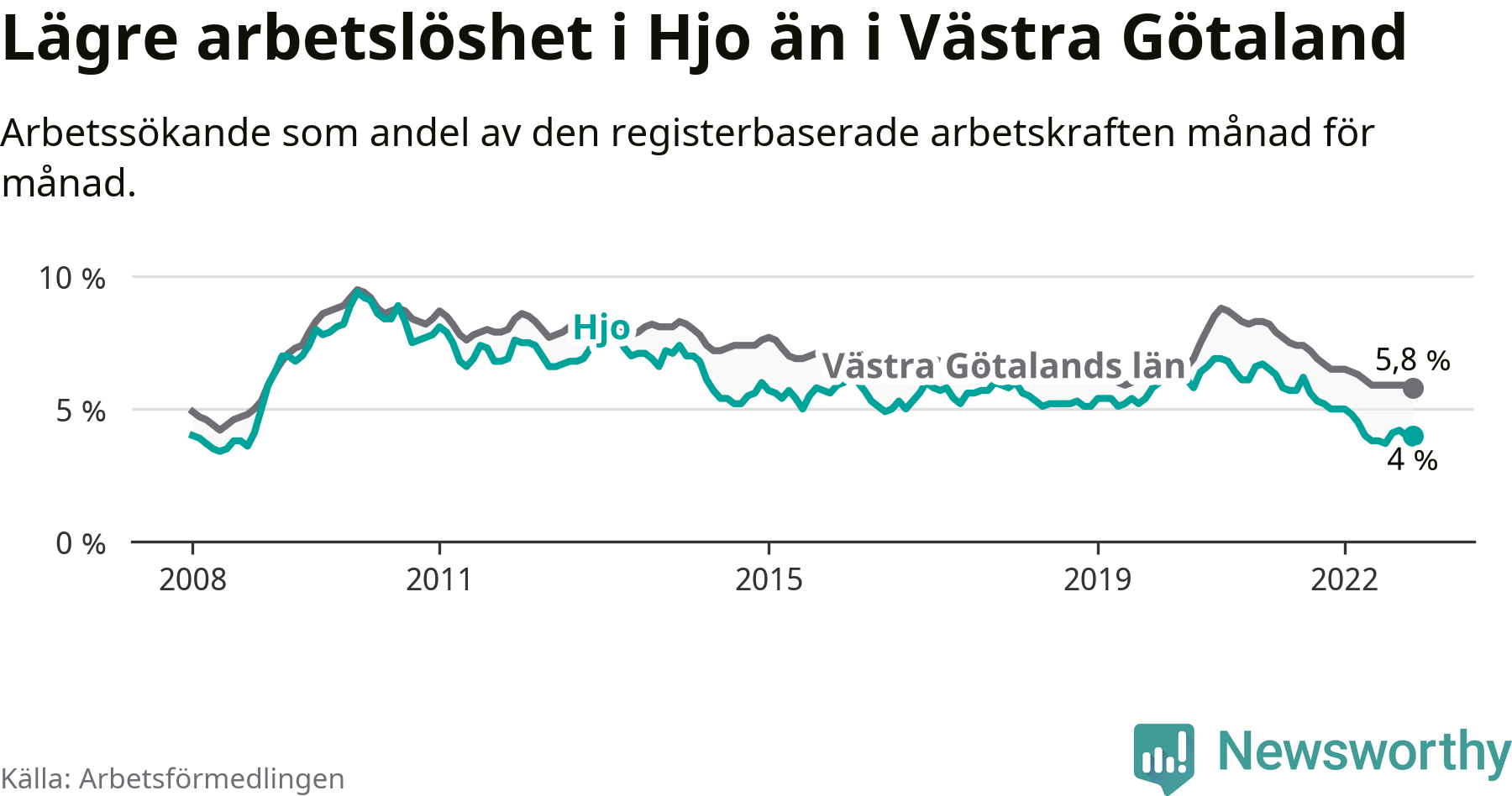 Hjo hade redan tidigare lägre arbetslöshet än snittet i hela Västra Götalands län och nu växer klyftan (4,0 procent i kommunen, jämfört med 5,8 procent i hela länet). Öckerö har den lägsta arbetslösheten i länet (2,5 procent), medan Trollhättan och Åmål har den högsta (9,1 procent). För att Hjo skulle komma ner i samma arbetslöshetsnivå som Öckerö skulle 62 personer behöva sysselsättas.