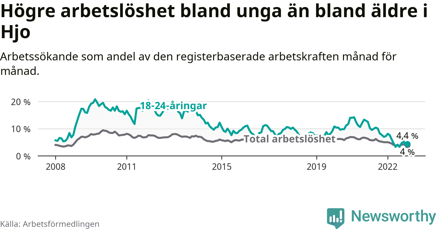 I och med den senaste månadens nedgång har de ungas arbetslöshet i Hjo sjunkit 20 månader i följd (ner från 12,5 procent i mars 2021 till 4,4 procent nu).