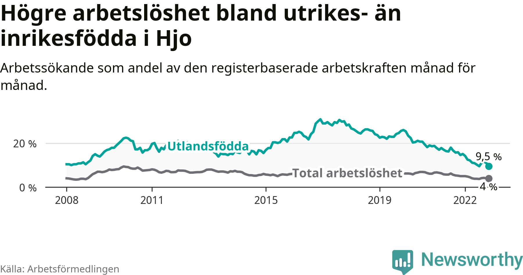 | Bland utlandsfödda | 9,5 % | −5,1 % ▼ | 14,9 % | −1,6 % ▼ | 16,5 % | −1,3 % ▼ |