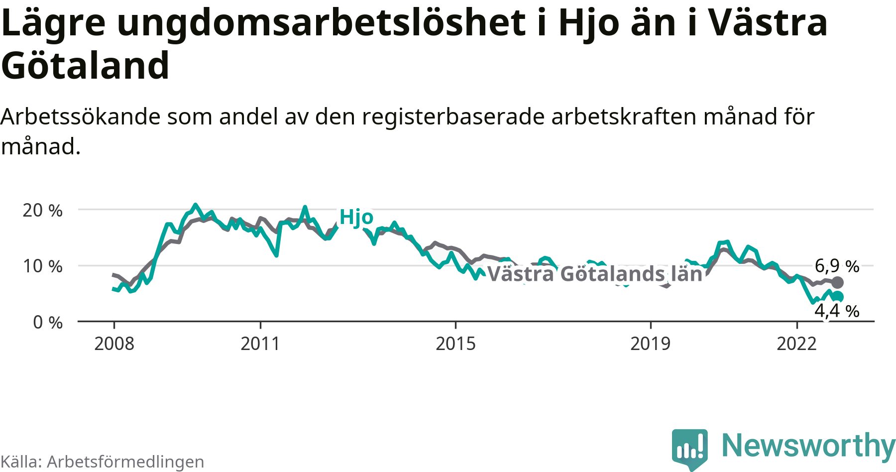 Precis som den totala arbetslösheten ligger ungdomsarbetslösheten i Hjo lägre än i Västra Götaland som helhet. Skillnaden mellan kommunen och länet är 2,5 procentenheter.