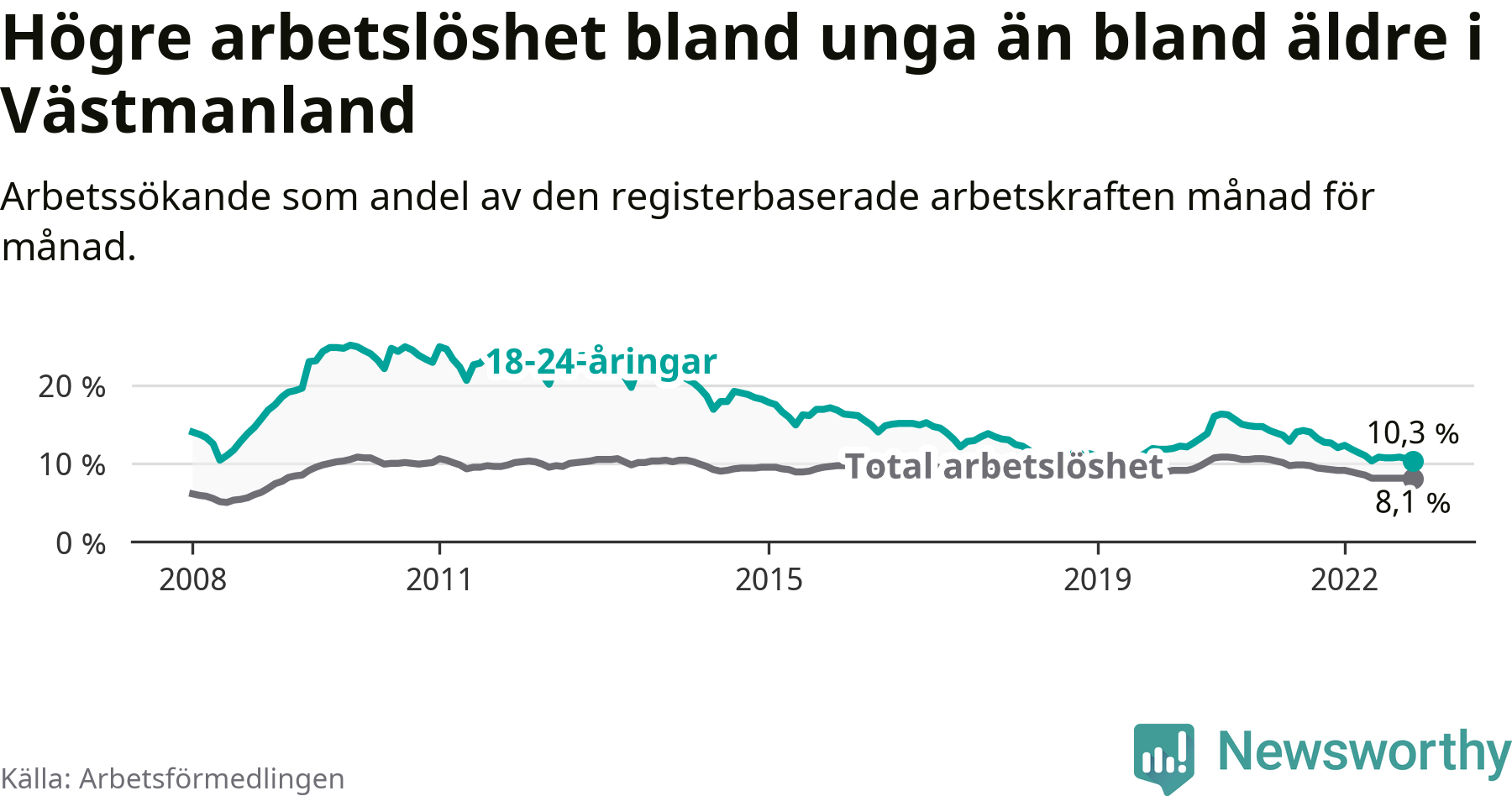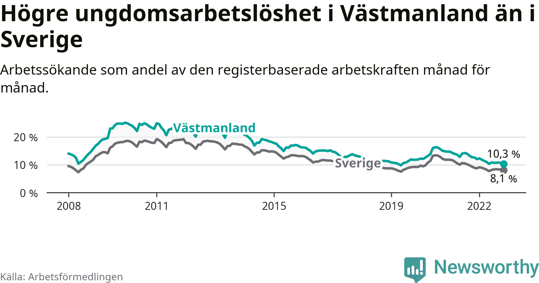 Precis som den totala arbetslösheten ligger ungdomsarbetslösheten i Västmanland högre än i Sverige som helhet. Skillnaden mellan länet och riket är 2,2 procentenheter.