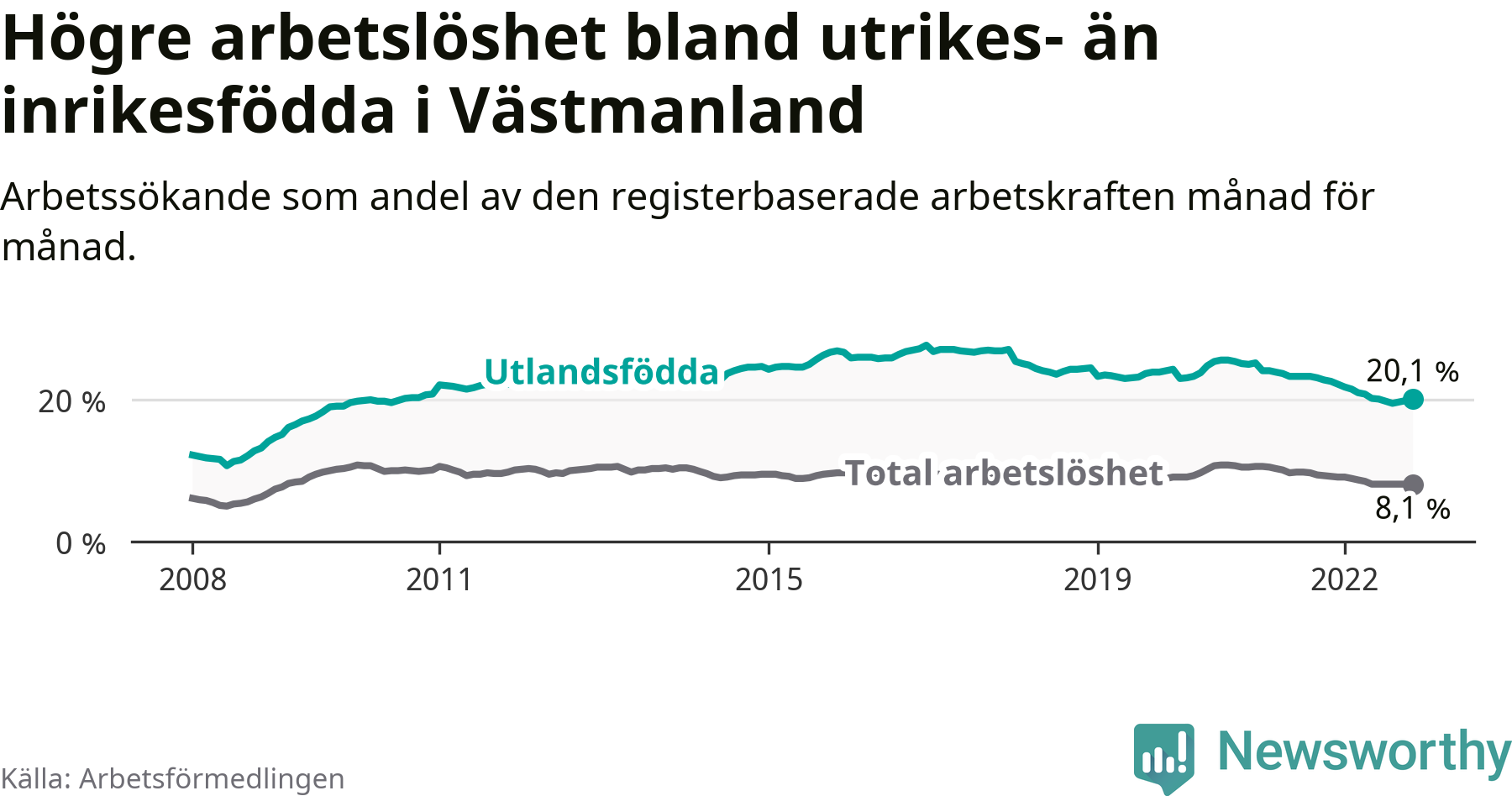 Arbetslösheten bland utlandsfödda var 20,1 procent i Västmanland under november månad, motsvarande 6 476 av 32 219 personer. Det är 2,5 procentenheter färre än vid samma tidpunkt i fjol (−904 om man räknar personer). Därmed är de utlandsföddas arbetslöshet lägre än vid samma tidpunkt i fjol för 20:e månaden i följd. Sedan mars 2021 har arbetslösheten bland utlandsfödda minskat från 23,9 till 20,1 procent.