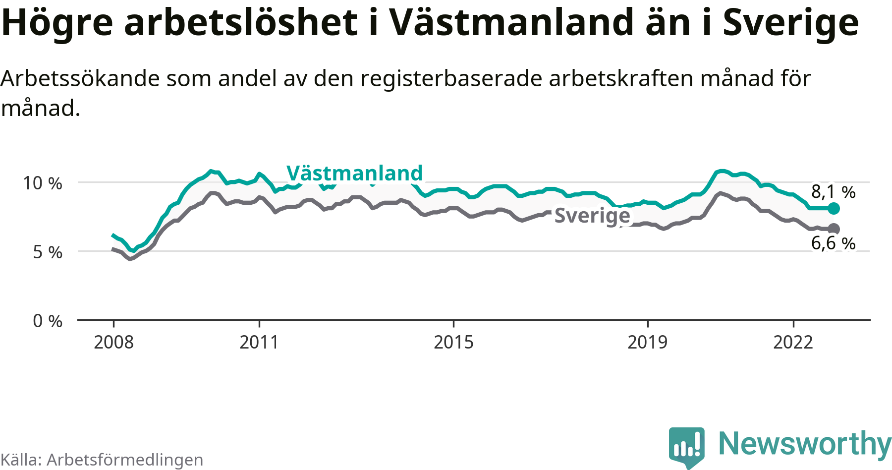 Även om arbetslösheten i Västmanland alltså minskar, så ligger den fortfarande över snittet i hela Sverige (8,1 procent i länet, jämfört med 6,6 procent i hela riket). Västerbotten har den lägsta arbetslösheten i riket (4,1 procent), medan Södermanland har den högsta (9,0 procent). För att Västmanland skulle komma ner i samma arbetslöshetsnivå som Västerbotten skulle 5 266 personer behöva sysselsättas.