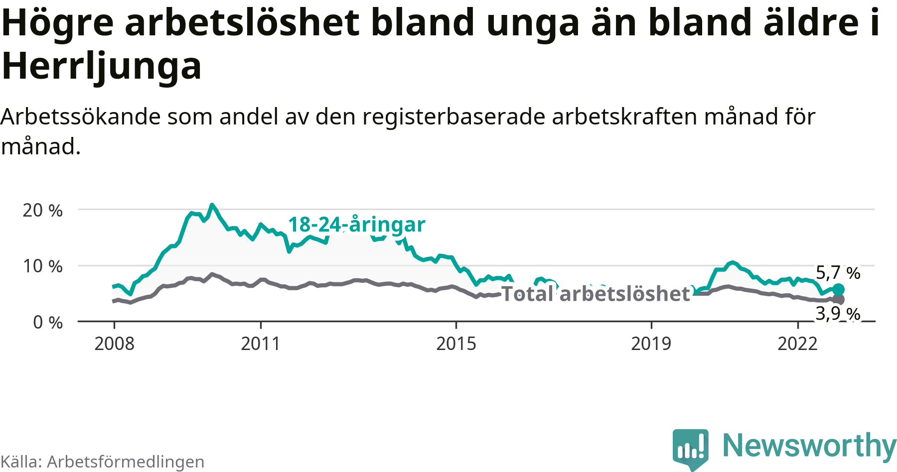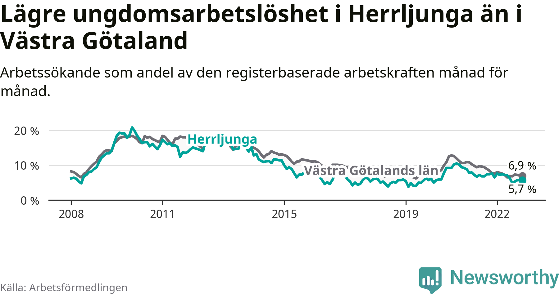 Precis som den totala arbetslösheten ligger ungdomsarbetslösheten i Herrljunga lägre än i Västra Götaland som helhet. Skillnaden mellan kommunen och länet är 1,2 procentenheter.