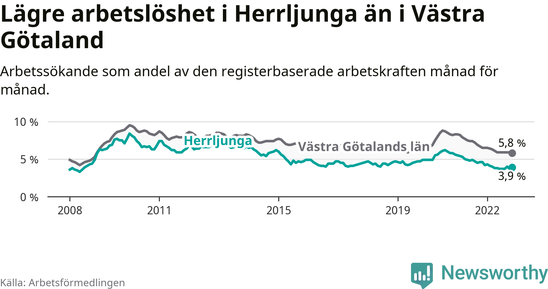 Herrljunga hade redan tidigare lägre arbetslöshet än snittet i hela Västra Götalands län och nu växer klyftan (3,9 procent i kommunen, jämfört med 5,8 procent i hela länet). Öckerö har den lägsta arbetslösheten i länet (2,5 procent), medan Trollhättan och Åmål har den högsta (9,1 procent). För att Herrljunga skulle komma ner i samma arbetslöshetsnivå som Öckerö skulle 62 personer behöva sysselsättas.