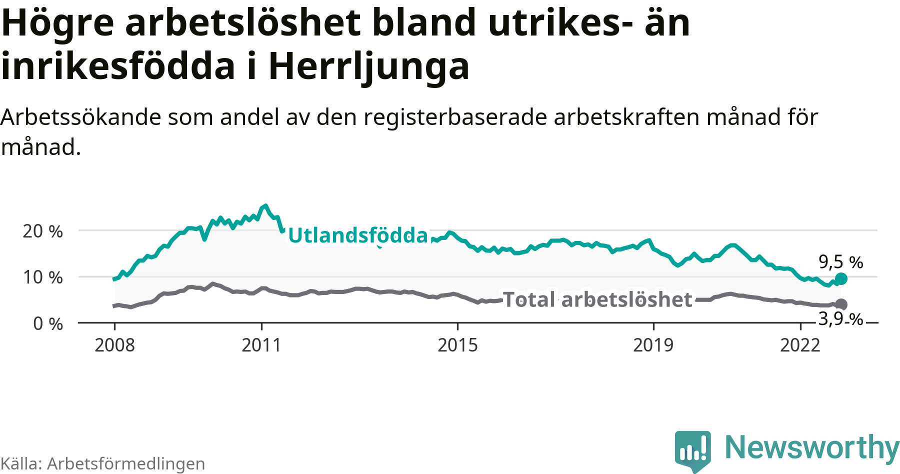 Arbetslösheten bland utlandsfödda var 9,5 procent i Herrljunga under november månad, motsvarande 59 av 621 personer. Det är 1,9 procentenheter färre än vid samma tidpunkt i fjol (−13 om man räknar personer). Därmed är de utlandsföddas arbetslöshet lägre än vid samma tidpunkt i fjol för 20:e månaden i följd. Sedan mars 2021 har arbetslösheten bland utlandsfödda minskat från 14,3 till 9,5 procent.