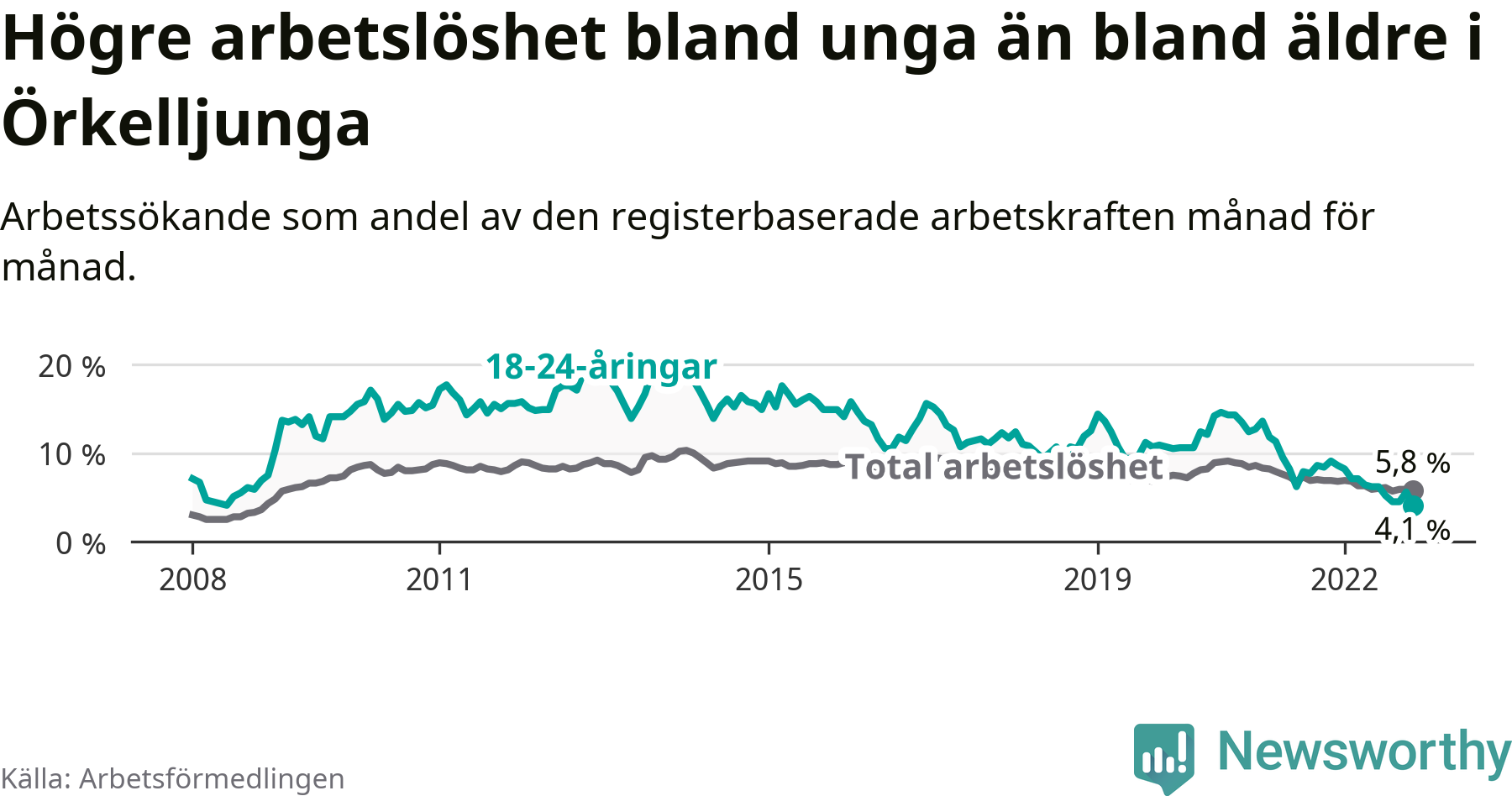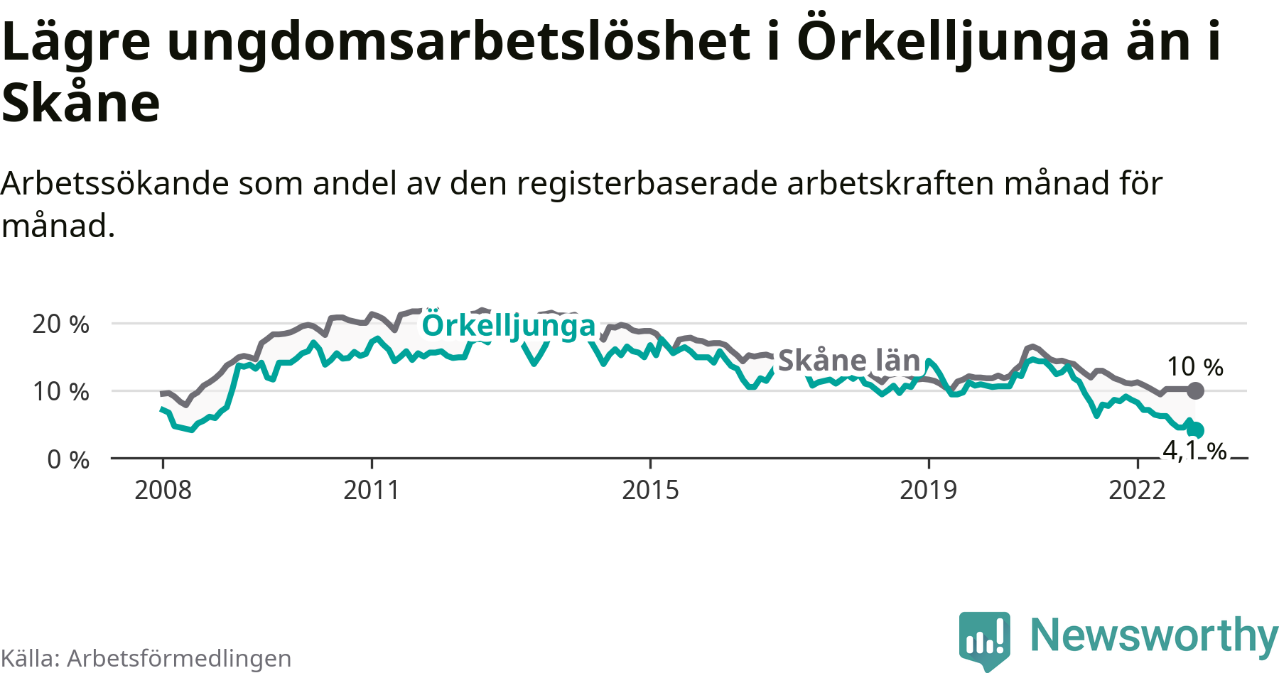 Precis som den totala arbetslösheten ligger ungdomsarbetslösheten i Örkelljunga lägre än i Skåne som helhet. Skillnaden mellan kommunen och länet är 5,9 procentenheter.