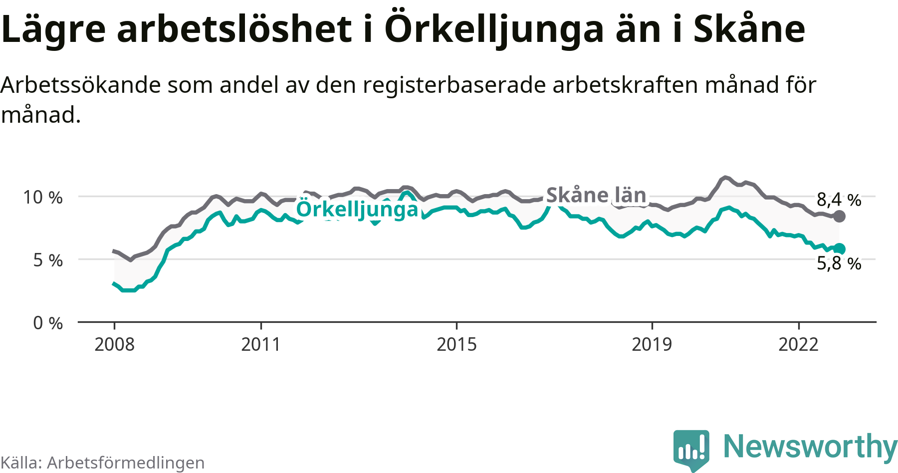 Örkelljunga hade redan tidigare lägre arbetslöshet än snittet i hela Skåne län och nu växer klyftan (5,8 procent i kommunen, jämfört med 8,4 procent i hela länet). Lomma och Vellinge har den lägsta arbetslösheten i länet (3,2 procent), medan Perstorp har den högsta (12,6 procent). För att Örkelljunga skulle komma ner i samma arbetslöshetsnivå som Lomma och Vellinge skulle 122 personer behöva sysselsättas.