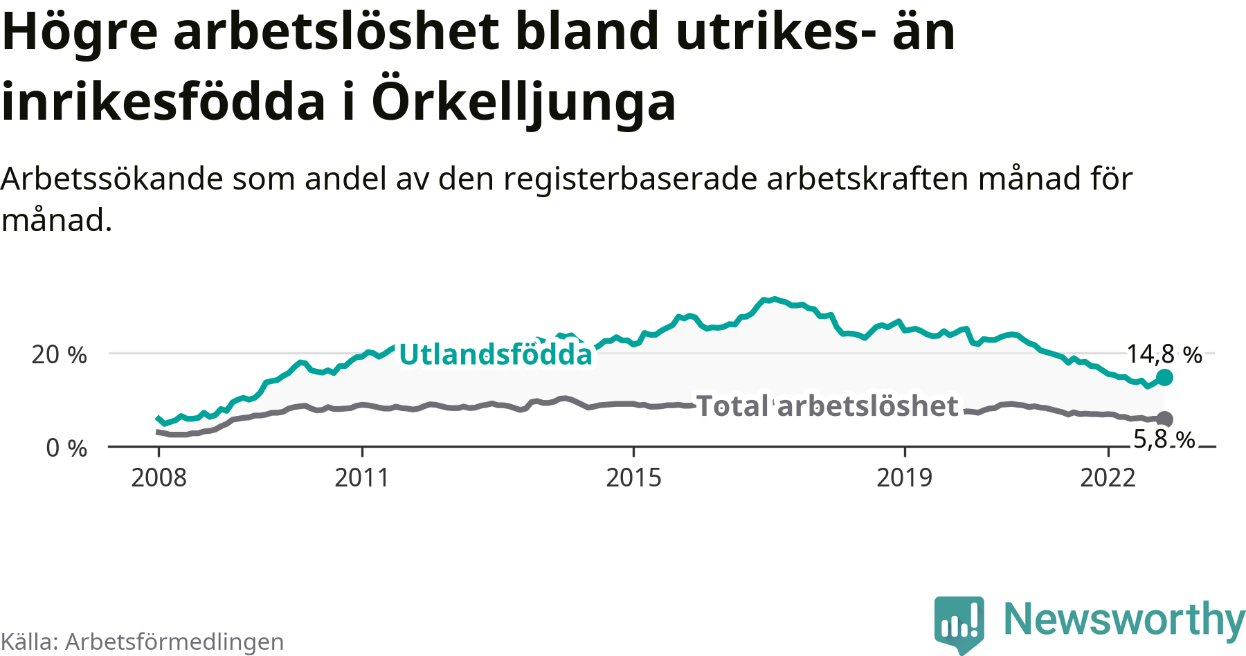 Arbetslösheten bland utlandsfödda var 14,8 procent i Örkelljunga under november månad, motsvarande 136 av 919 personer. Det är 2,3 procentenheter färre än vid samma tidpunkt i fjol (−19 om man räknar personer). Därmed har de utlandsföddas arbetslöshet varit lägre än vid samma tidpunkt i fjol i över två år i sträck. Sedan september 2020 har arbetslösheten bland utlandsfödda minskat från 23,8 till 14,8 procent.