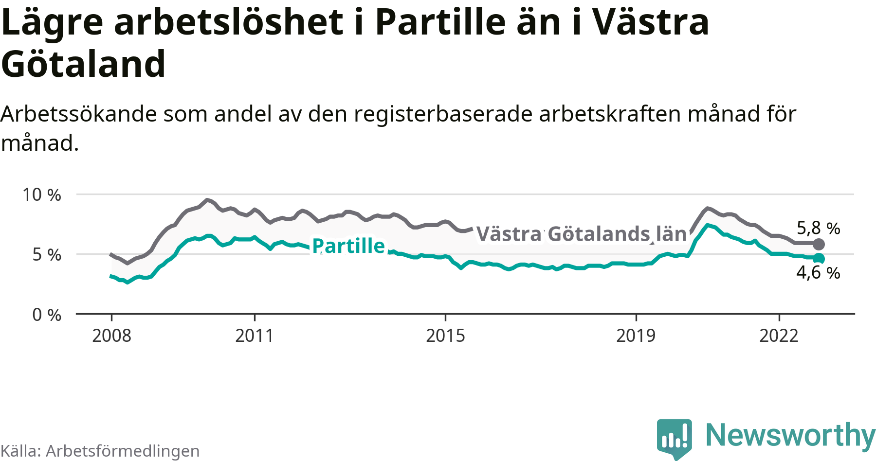 Partille hade redan tidigare lägre arbetslöshet än snittet i hela Västra Götalands län och nu växer klyftan (4,6 procent i kommunen, jämfört med 5,8 procent i hela länet). Öckerö har den lägsta arbetslösheten i länet (2,5 procent), medan Trollhättan och Åmål har den högsta (9,1 procent). För att Partille skulle komma ner i samma arbetslöshetsnivå som Öckerö skulle 414 personer behöva sysselsättas.
