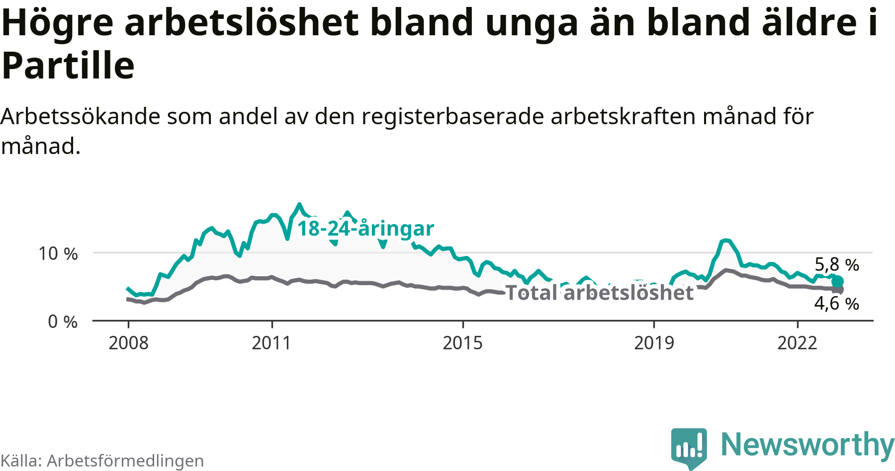 I och med den senaste månadens nedgång har de ungas arbetslöshet i Partille sjunkit 20 månader i följd (ner från 8,1 procent i mars 2021 till 5,8 procent nu).