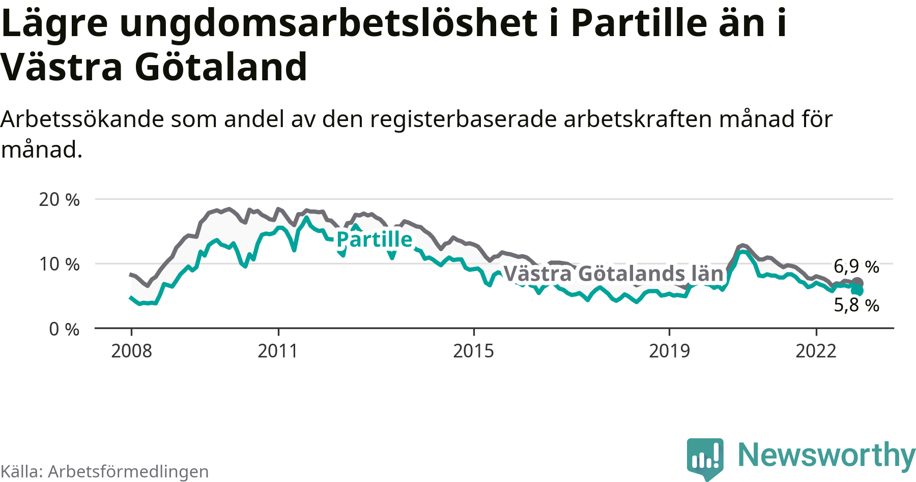 Precis som den totala arbetslösheten ligger ungdomsarbetslösheten i Partille lägre än i Västra Götaland som helhet. Skillnaden mellan kommunen och länet är 1,1 procentenheter.