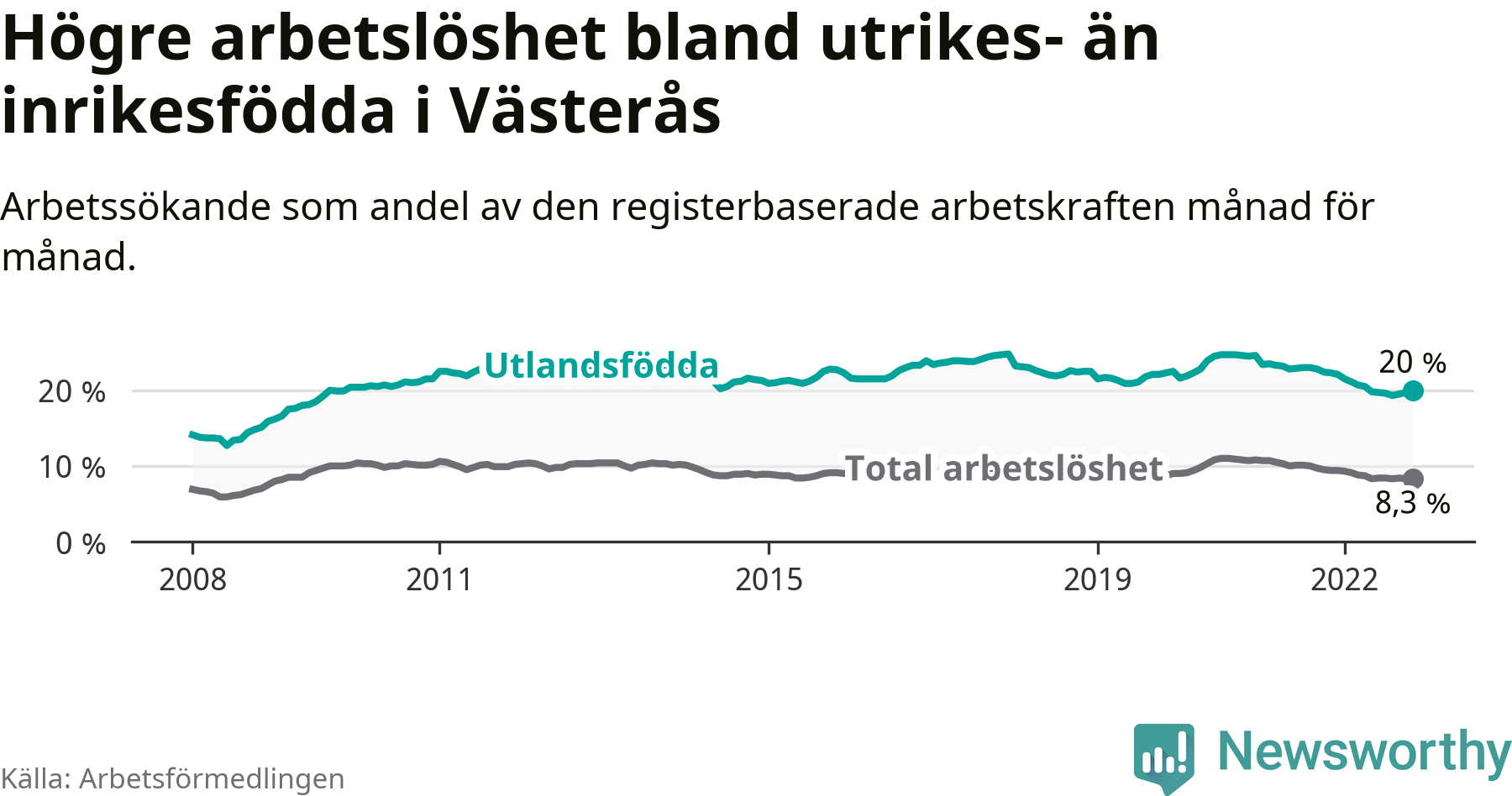 Skillnaden i arbetslöshet mellan utrikesfödda och hela befolkningen är 11,7 procentenheter i Västerås. Det är en mindre skillnad än för ett år sedan (−1,2 procentenheter).
