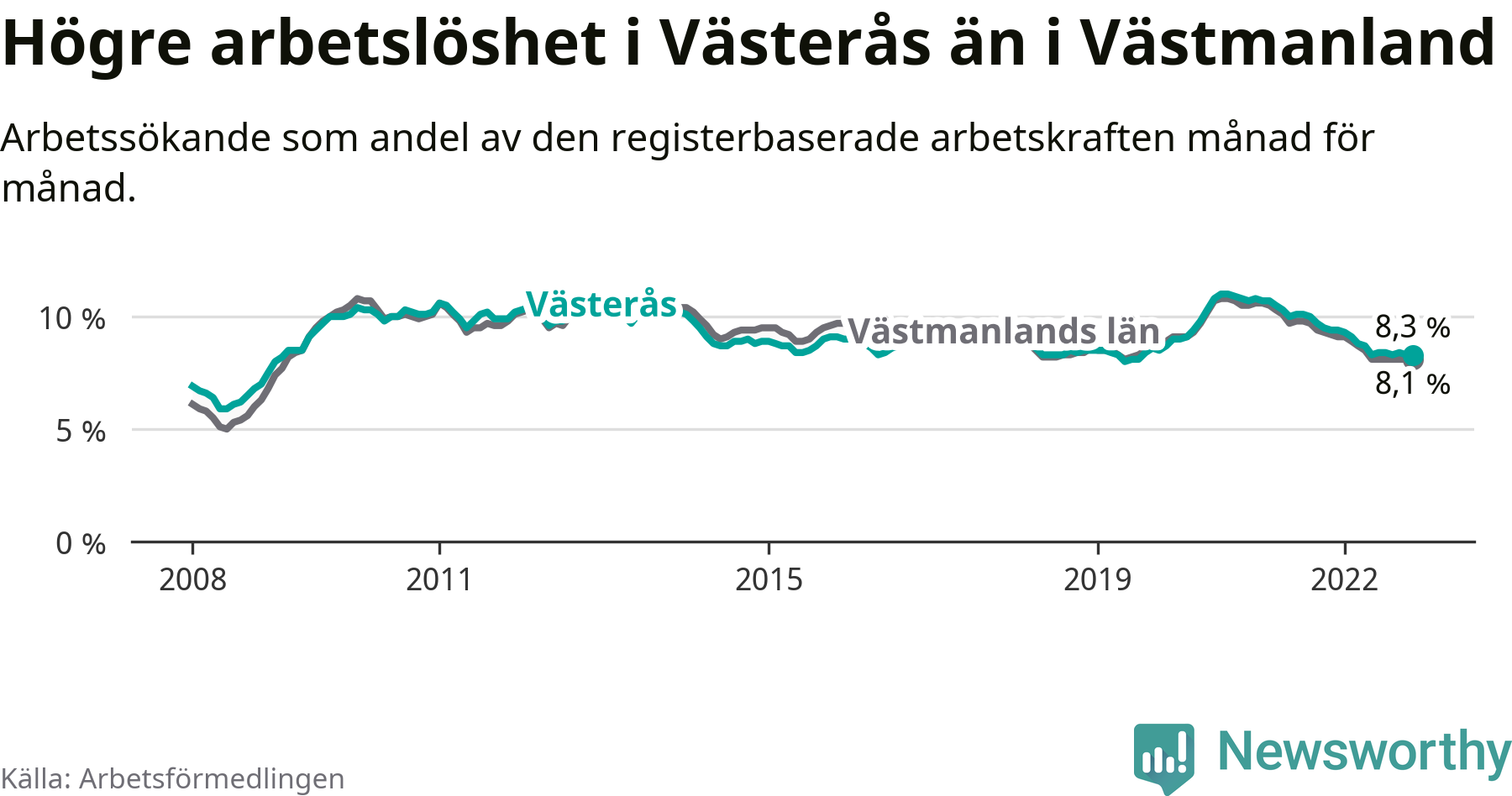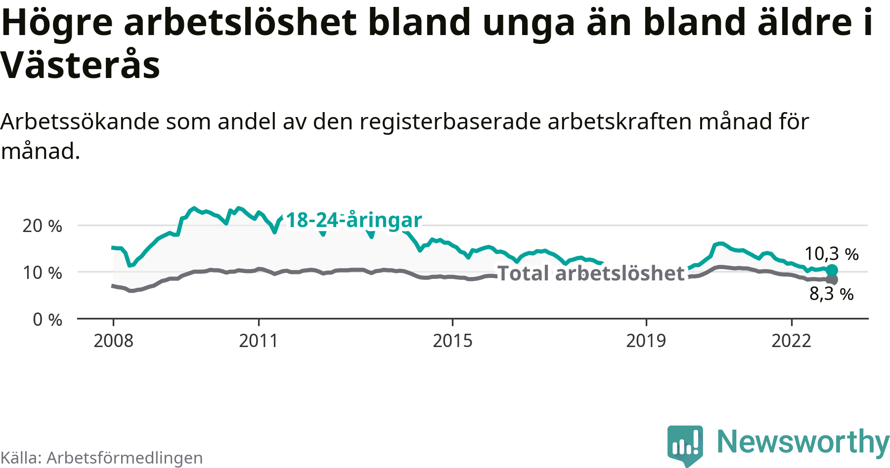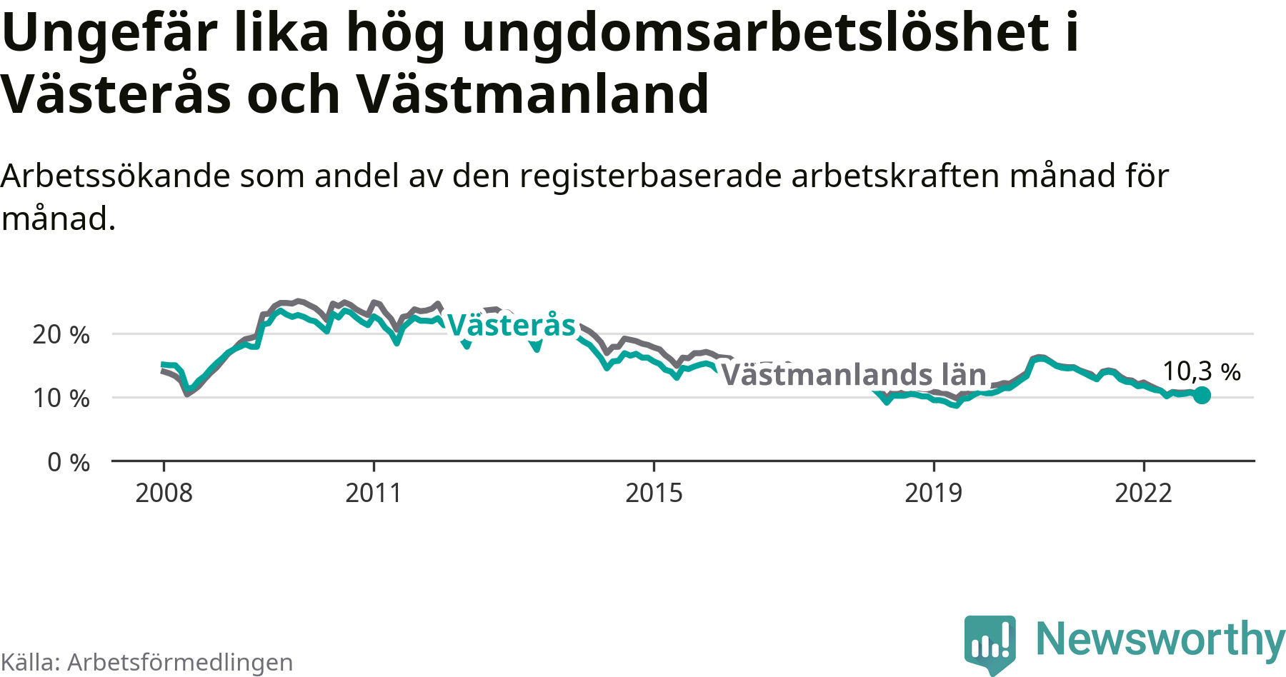 Medan Västerås har högre total arbetslöshet än Västmanland, ligger ungdomsarbetslösheten på i stort sett samma nivå.
